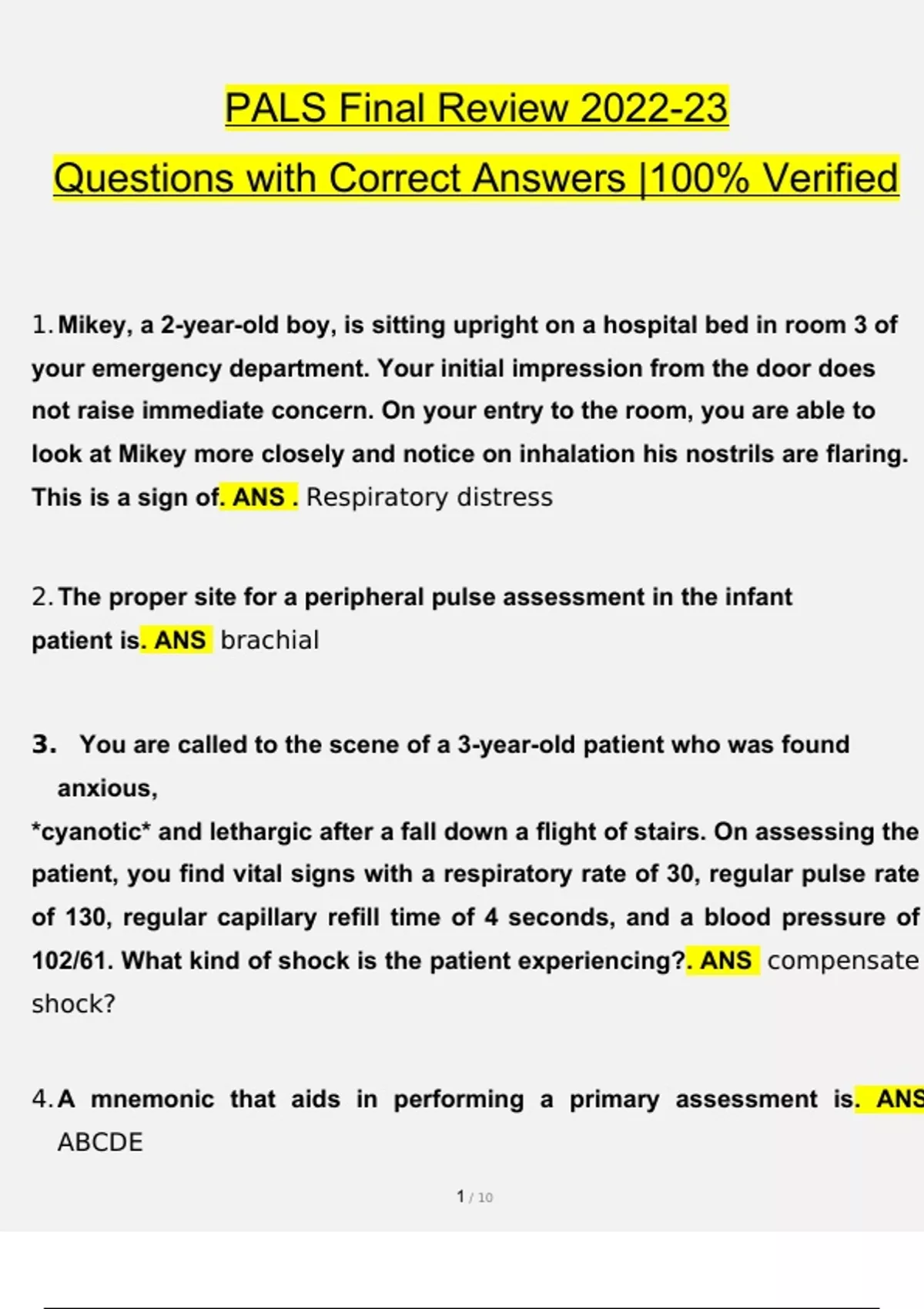 PALS Test 2022-23 Questions With Correct Answers |100% Verified, AHA PALS Practice Exam 2022-23, PALS AHA EXAM ,PALS Final Review ,PALS Post Test