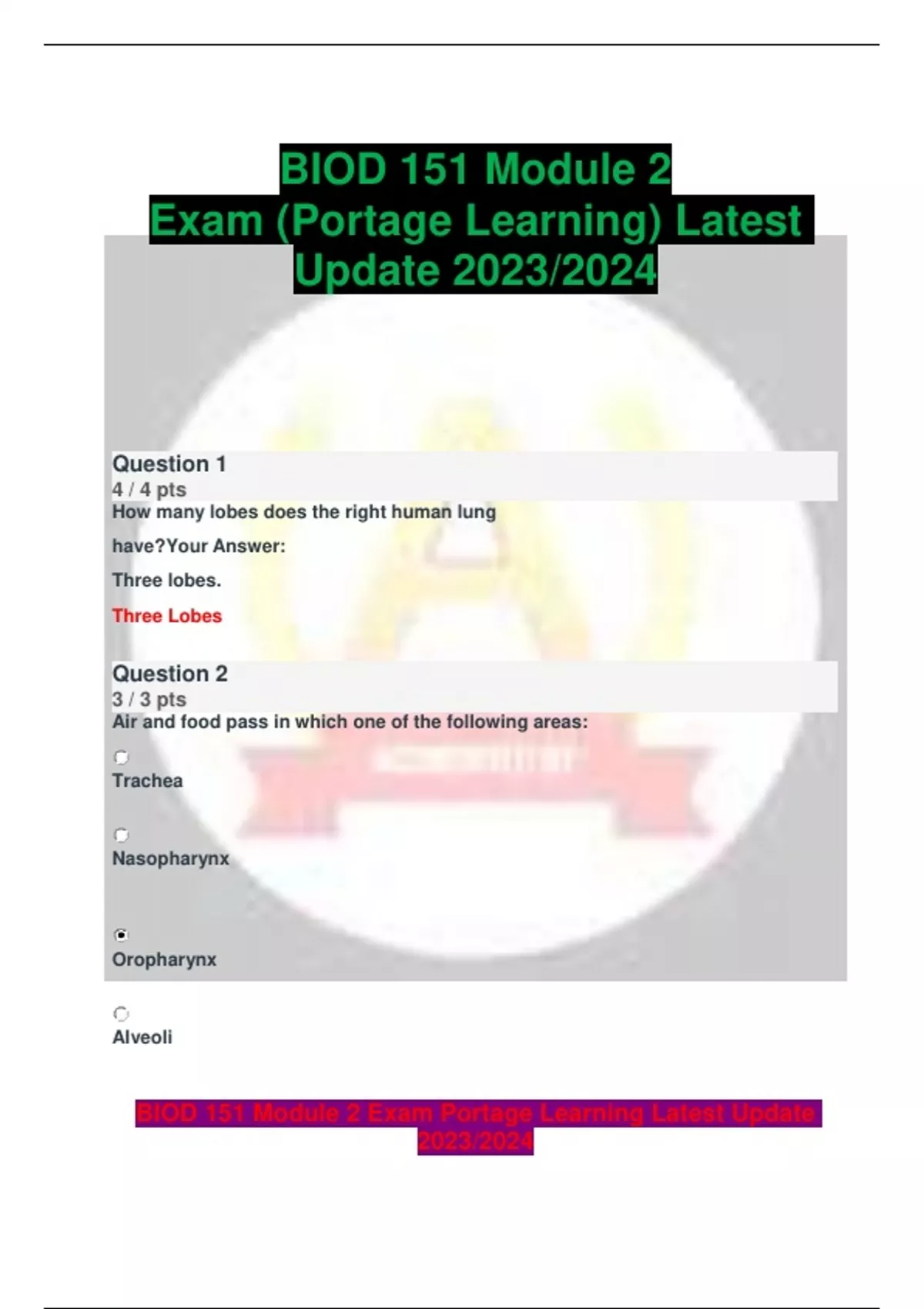 BIOD 151 Module 2 Exam (Portage Learning) Latest Update 2023/2024 2 Exam (elaborations) BIOD 151 - BIOD 151 Module 4 Exam Answer Key (Portage learning) LATEST UPDATED 2023/2024 3 Exam (elaborations) BIOD 151 - BIOD 151 Module 6 Exam Review Answer Key (Portage learning) LATEST 2023 GRADED PASS