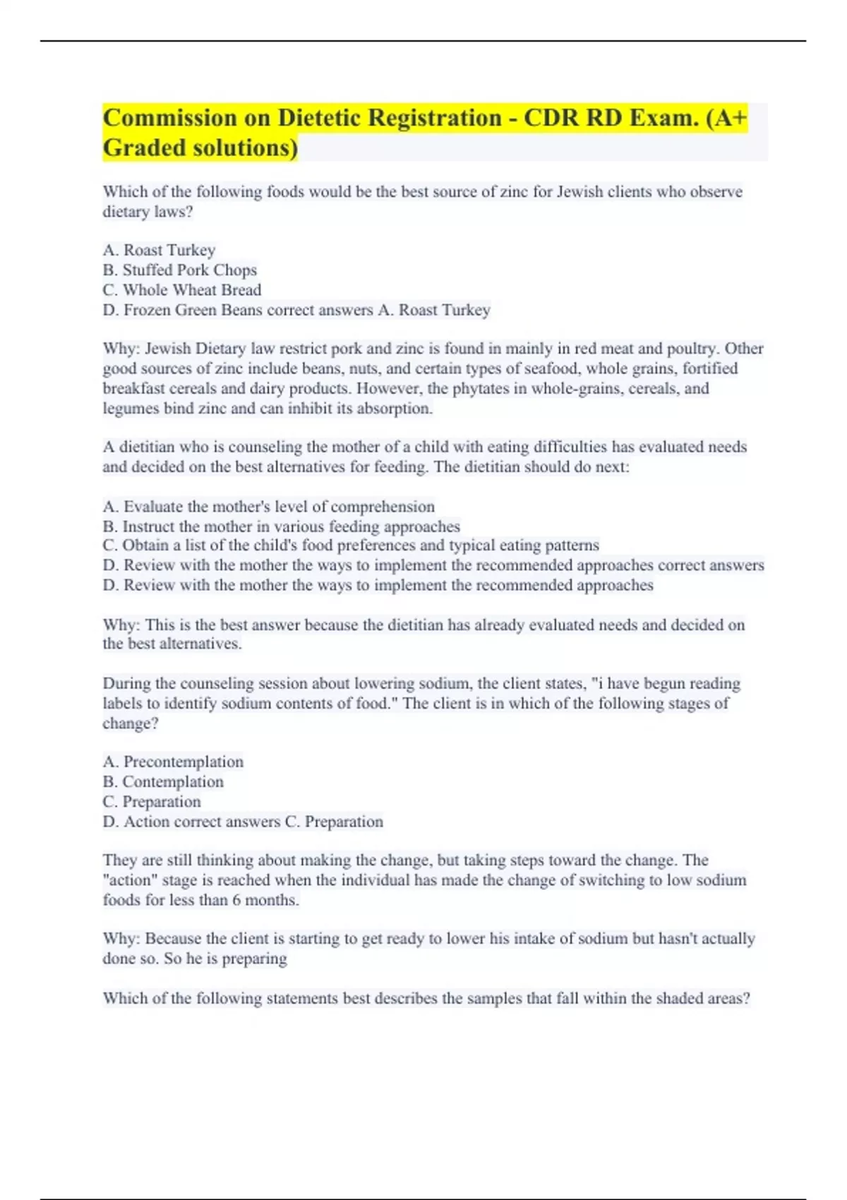 Commission on Dietetic Registration - CDR RD Exam. (A+ Graded solutions) Commission on Dietetic Registration - CDR Practice Exam 1 (A+ Graded already). RD - Registered Dietitian EXAM #3: CDR Study Guide (10th edition) with complete solutions. RD - Registered Dietitian Exam Practice Test 1 (CDR) A+ Guaranteed. RD - Registered Dietitian EXAM #3: CDR