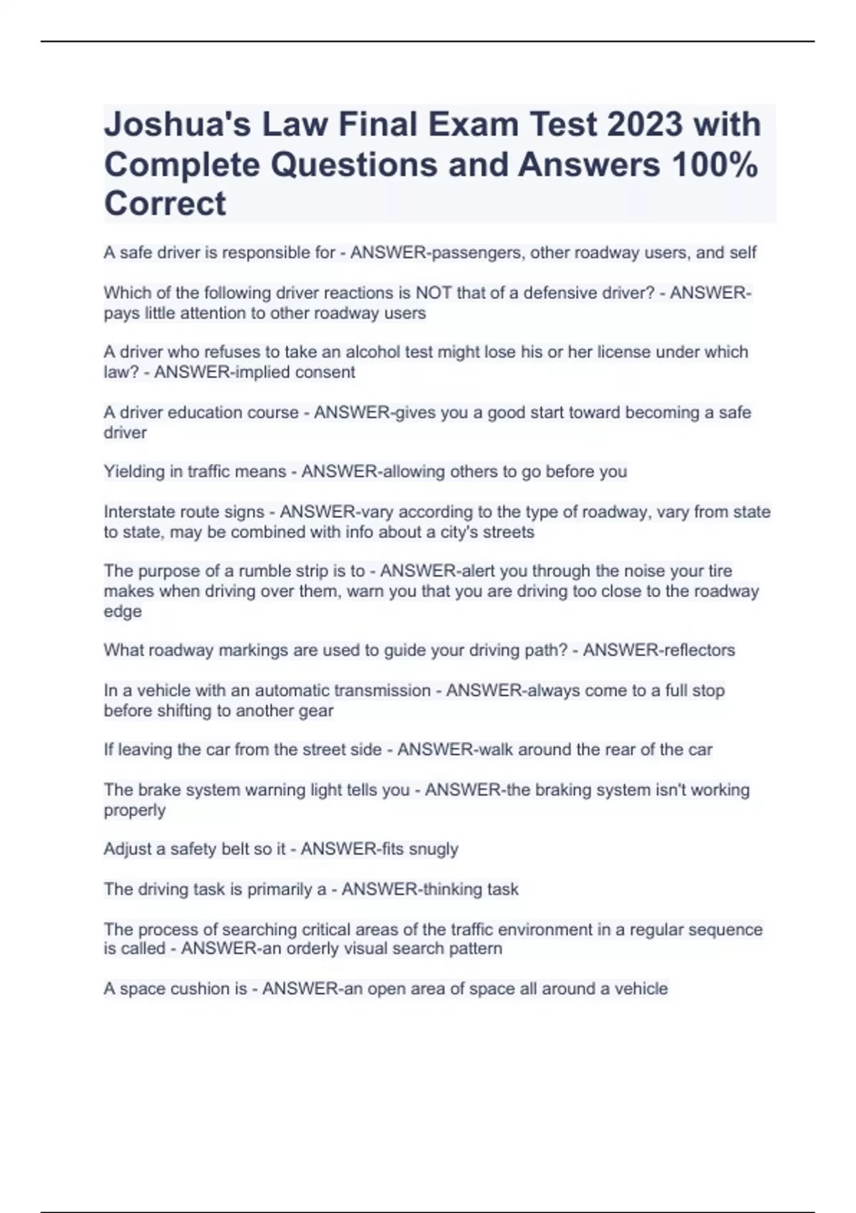 Joshua's Law Unit Exam Complete Bundle with 100% Correct AnswersJoshua's Law Unit Exam Complete Bundle with 100% Correct AnswersJoshua's Law Unit Exam Complete Bundle with 100% Correct Answers