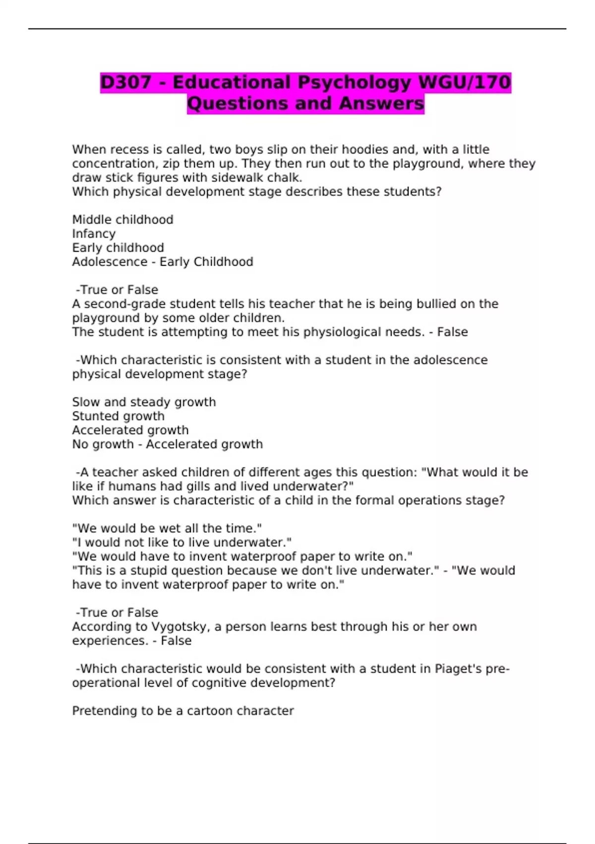 WGU D307 Educational Psychology Exams - Questions and Answers - Package Deal