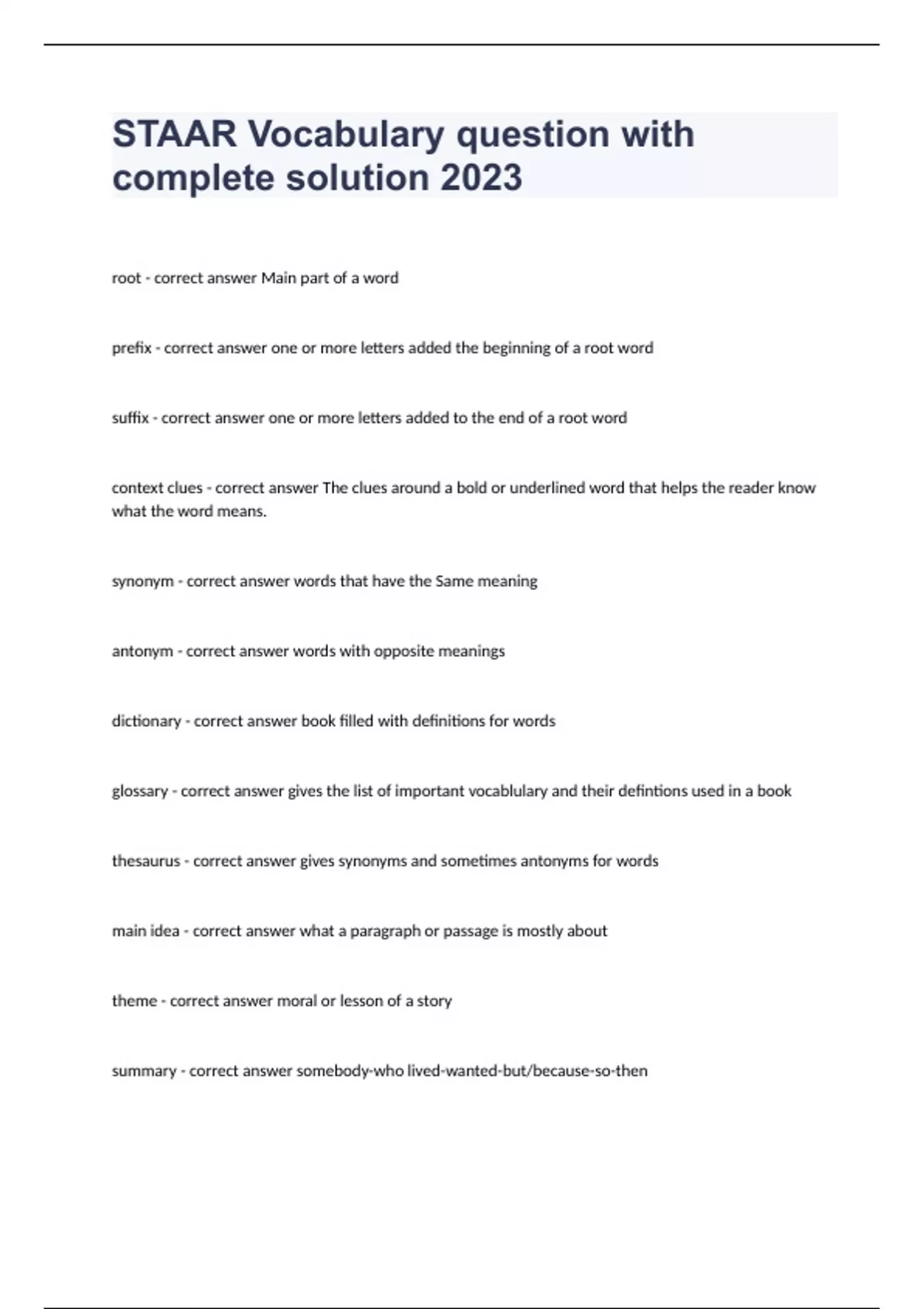 STAAR Vocabulary question with complete solution 2023