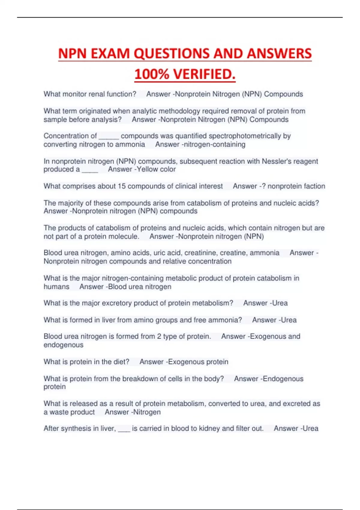 NON-PROTEIN NITROGEN COMPOUND (NPN) EXAM's PACKEGE DEAL ( With complete solution guides)NON-PROTEIN NITROGEN COMPOUND (NPN) EXAM's PACKEGE DEAL ( With complete solution guides)NON-PROTEIN NITROGEN COMPOUND (NPN) EXAM's PACKEGE DEAL ( With complete solution guides)NON-PROTEIN NITROGEN COMPOUND (NPN) EXAM's PACKEGE DEAL ( With complete solution guide