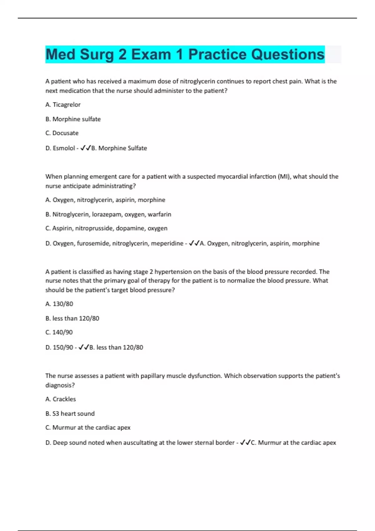 Med Surg 2 Exam 1 Practice | Questions With 100% Correct Answers | Verified