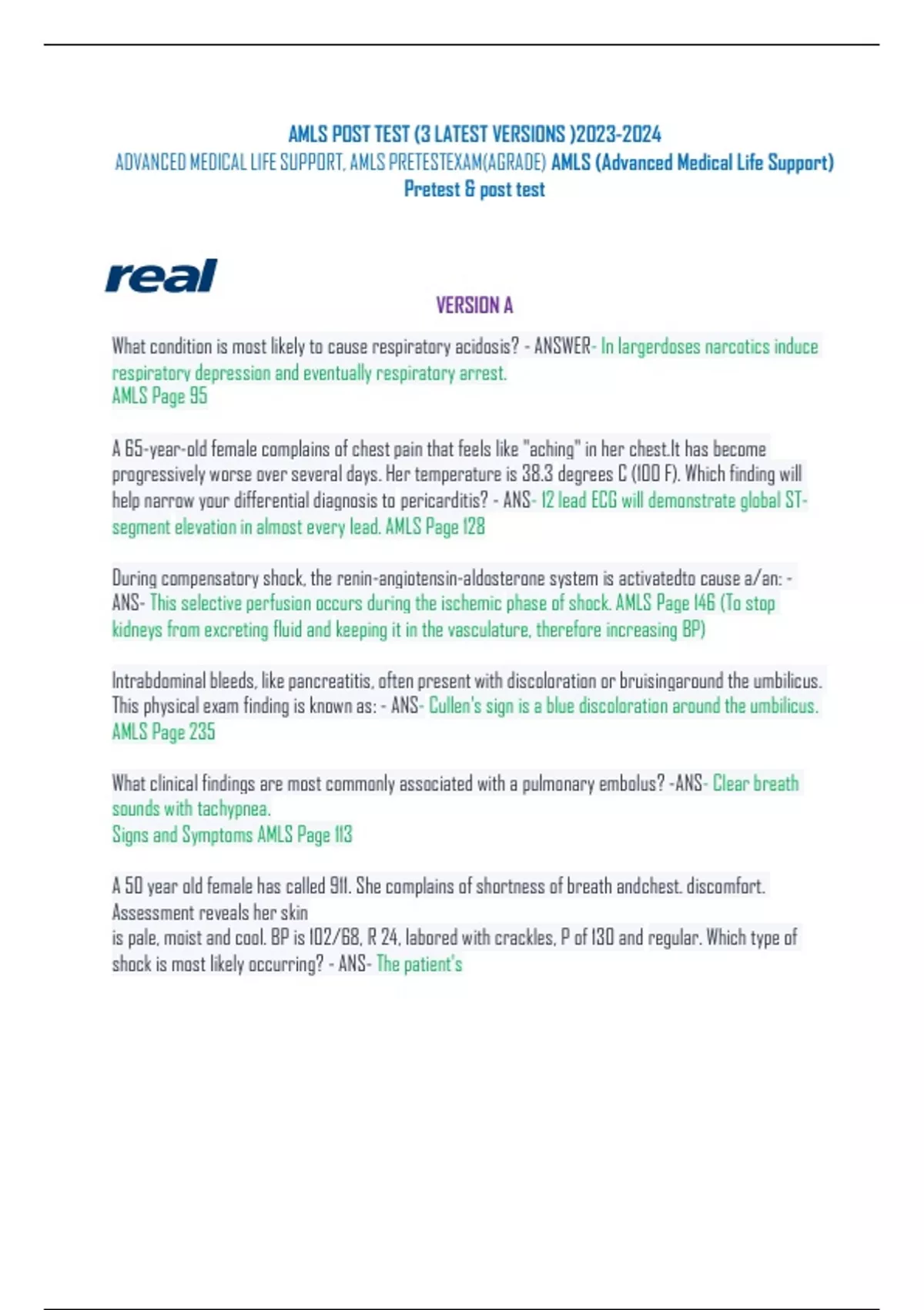 AMLS POST TEST (3 LATEST VERSIONS ) ADVANCED MEDICAL LIFE SUPPORT, AMLS PRETEST EXAM(AGRADE) AMLS (Advanced Medical Life Support) Pretest & post test