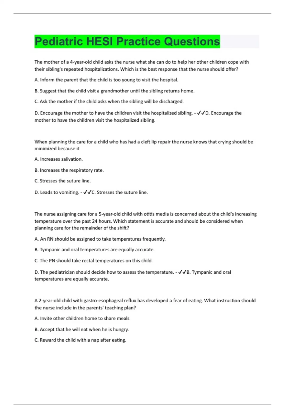 Pediatric HESI Practice Questions| Questions with 100% Correct Answers | Verified