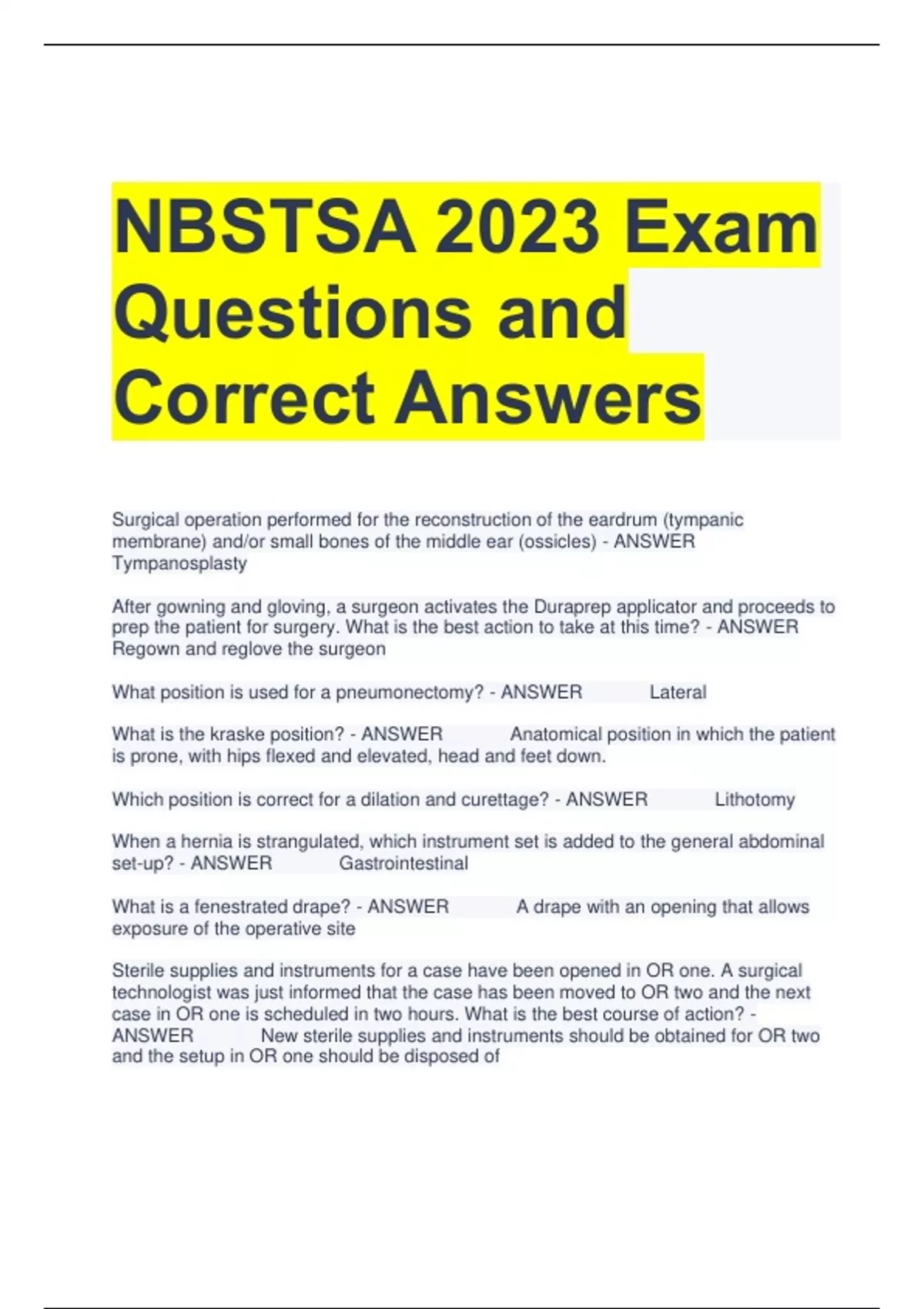NBSTSA STUDY PREP QUESTIONS AND CORRECT ANSWERS 2 Exam (elaborations) NBSTSA CST Practice Exam Questions and Answers 3 Exam (elaborations) NBSTSA Practice Test Questions and Answers All Correct 4 Exam (elaborations) NBSTSA Practice Test Questions and Answers All Correct 5 Exam (elaborations) NBSTSA CST Exam Prep Questions with Correct Answers