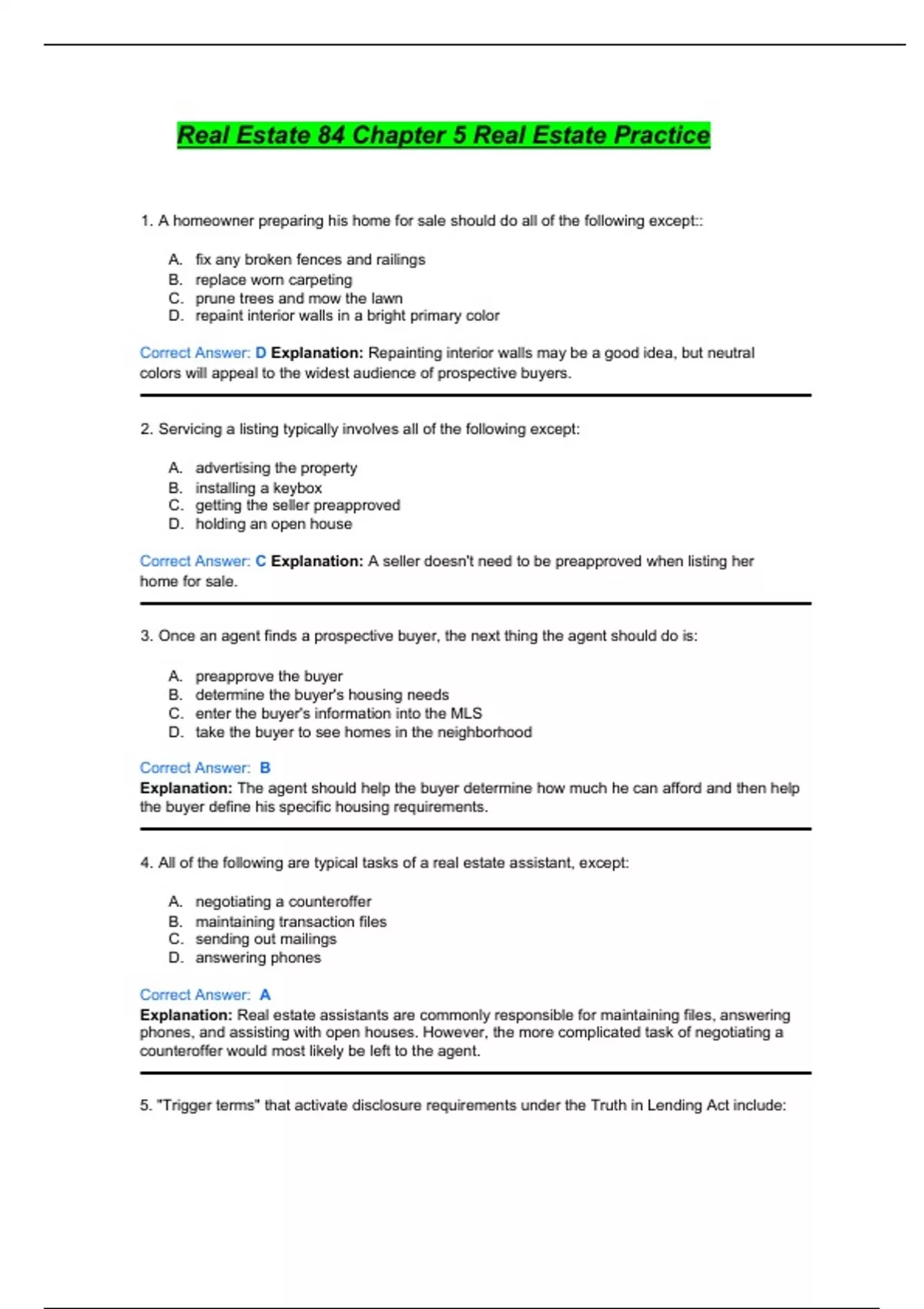 Real Estate 84 Chapter 1 - Chapter 5 Real Estate Practice Quizzes.