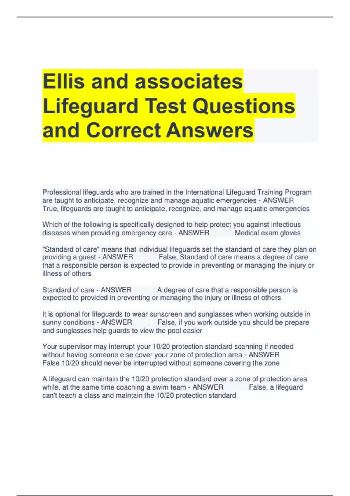 Ellis & Associates Lifeguard Test Questions and Answers 2 Exam (elaborations) ELLIS AND ASSOCIATES LIFEGUARD RENEWAL QUESTIONS AND CORRECT ANSWERS 3 Exam (elaborations) Ellis and Associates Lifeguard Training Exam Questions with All Correct Answers 4 Exam (elaborations) Ellis and Associates ILTP Study Guide Questions and Answers 5 Exam (elabora