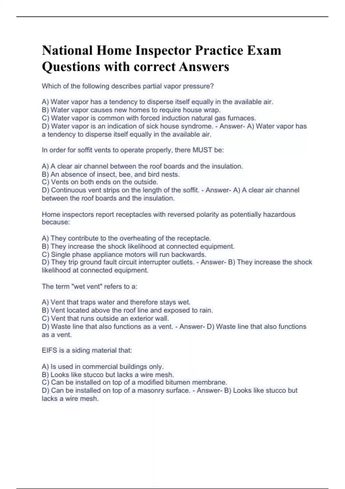 National Home Inspector Practice Exam Questions with correct Answers Home Inspector National Exam Prep Questions and Answers National Home inspector exam 494 questions and answers National Home Inspector Exam (NHIE) Whole House Practice Quiz Questions and Answers Exam Prep 7 Home Inspecting practice test Home inspection test 2023-solved Home Inspec