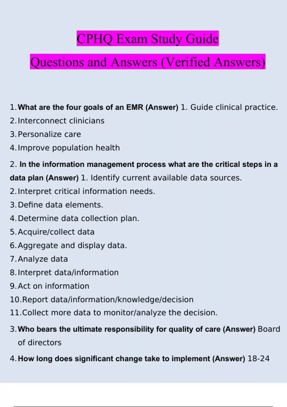 CPHQ Practice Exam, Test, Study Guide Questions, With Complete Answers Verified Solution| Bundle Pack