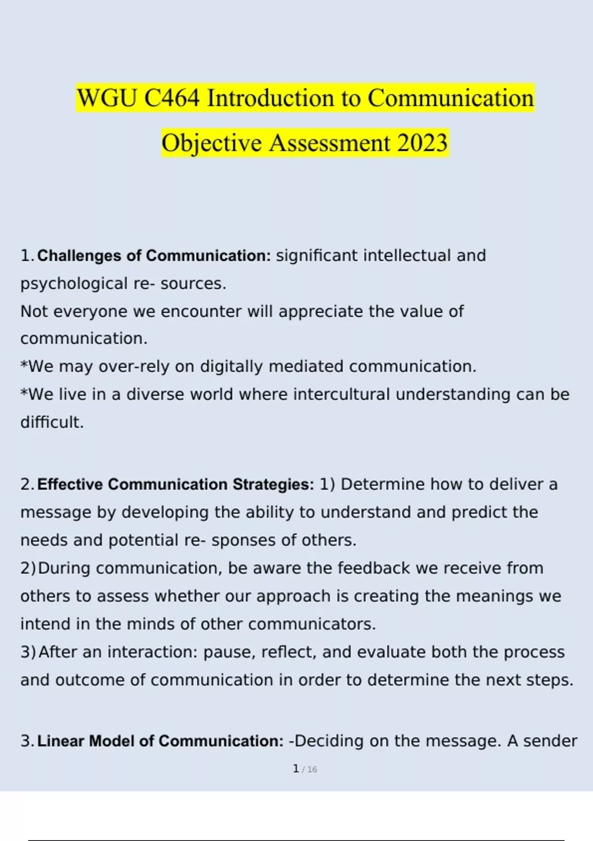 Summary WGU C464 Introduction to Communication Study Guide For Objective Assessment 2023 Verified