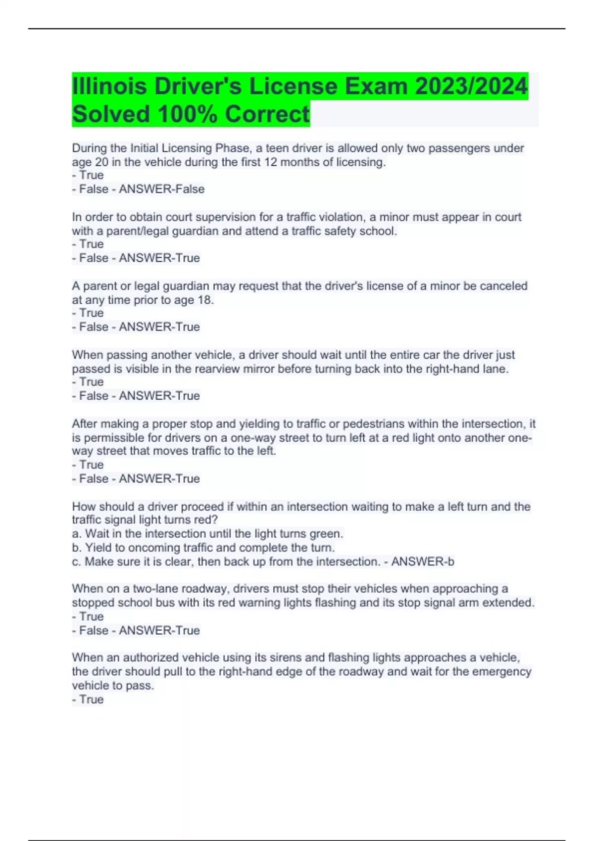 Illinois Driver s License Exam 2023/2024 Solved 100% Correct Illinois Driving Test 2023/2024 Answered Illinois DMV Practice 2021/2023 Graded A+