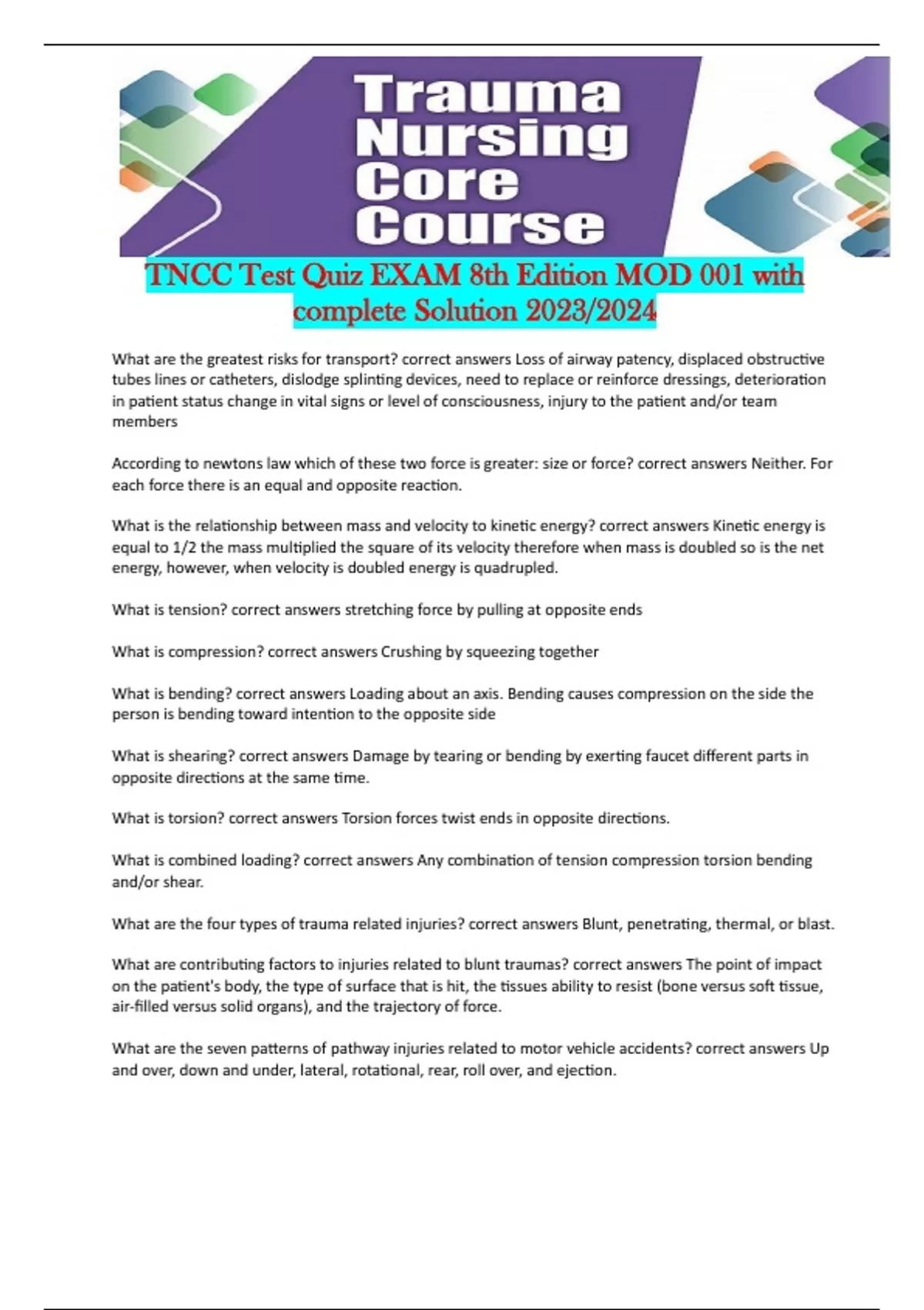 TNCC BUNDLED Test Quiz EXAMS, 8th Edition with complete Solution 2023/2024 VERIFIED