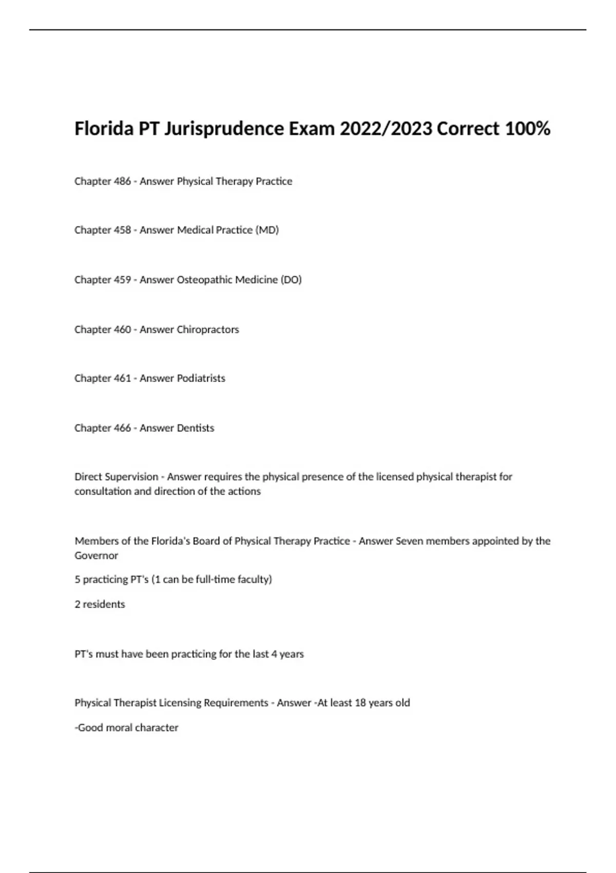 Florida PT Jurisprudence Exam, Florida PT Jurisprudence Exam With 100% Correct Answer, Florida PT jurisprudence Exam With All Correct Answers, Practice Exam, Laws and Rules for PT, Laws And Rules Exam, FLORIDA PT JURISPRUDENCE EXAMINATION, Florida PT Jurisprudence Exam With 100% Correct Answers