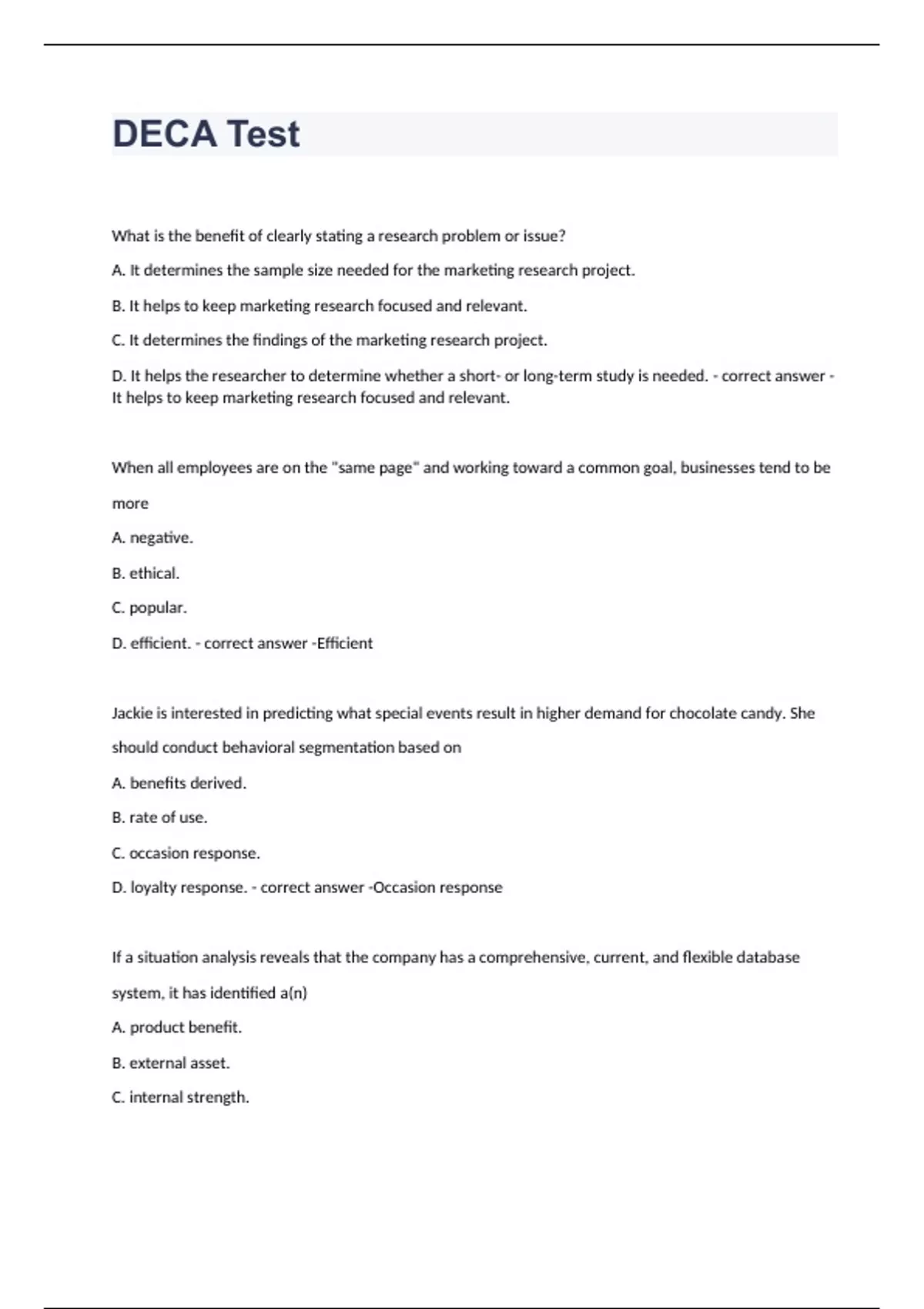 DECA Test exam 2023 with 100% correct answers DECA Marketing cluster exam 2023 with 100% correct answers