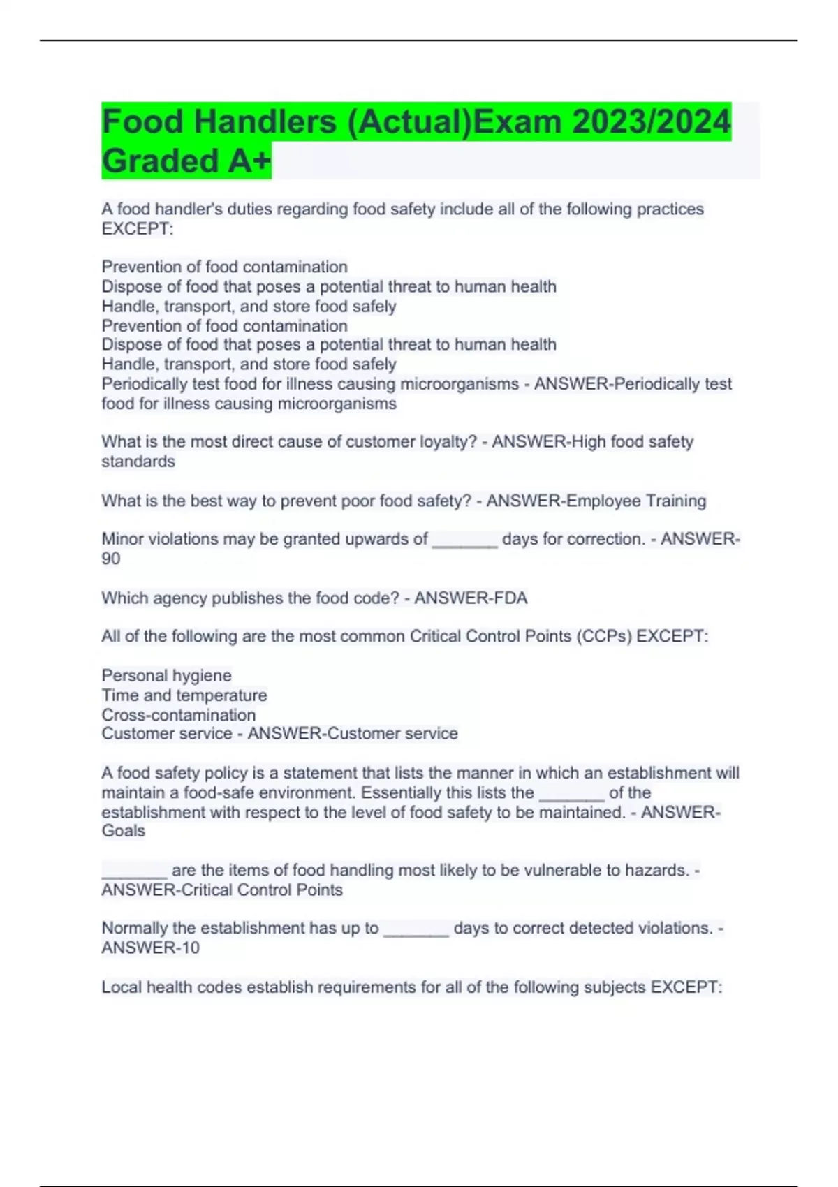 Food Handlers (Actual)Exam 2023/2024 Graded A+ Food Handler Test 2023/2024 Graded A+ CA Food Handler Exam with Complete Solutions Food Handler Safety Test 2023/2024 Food Handler s Study Guide Graded A+ Food handlers’ course: multiple choice Exam with Complete Solutions Food Handlers License Exam with Complete Solutions Food Handlers License Test