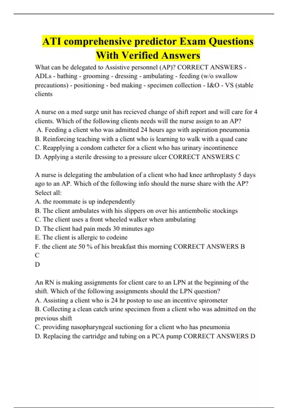 ATI comprehensive predictor 1 Exam With Correct Solutions study these, Ati, Comprehensive predictor test 85 correct answer, VATI Greenlight, VATI Exam Questions And Complete Answers