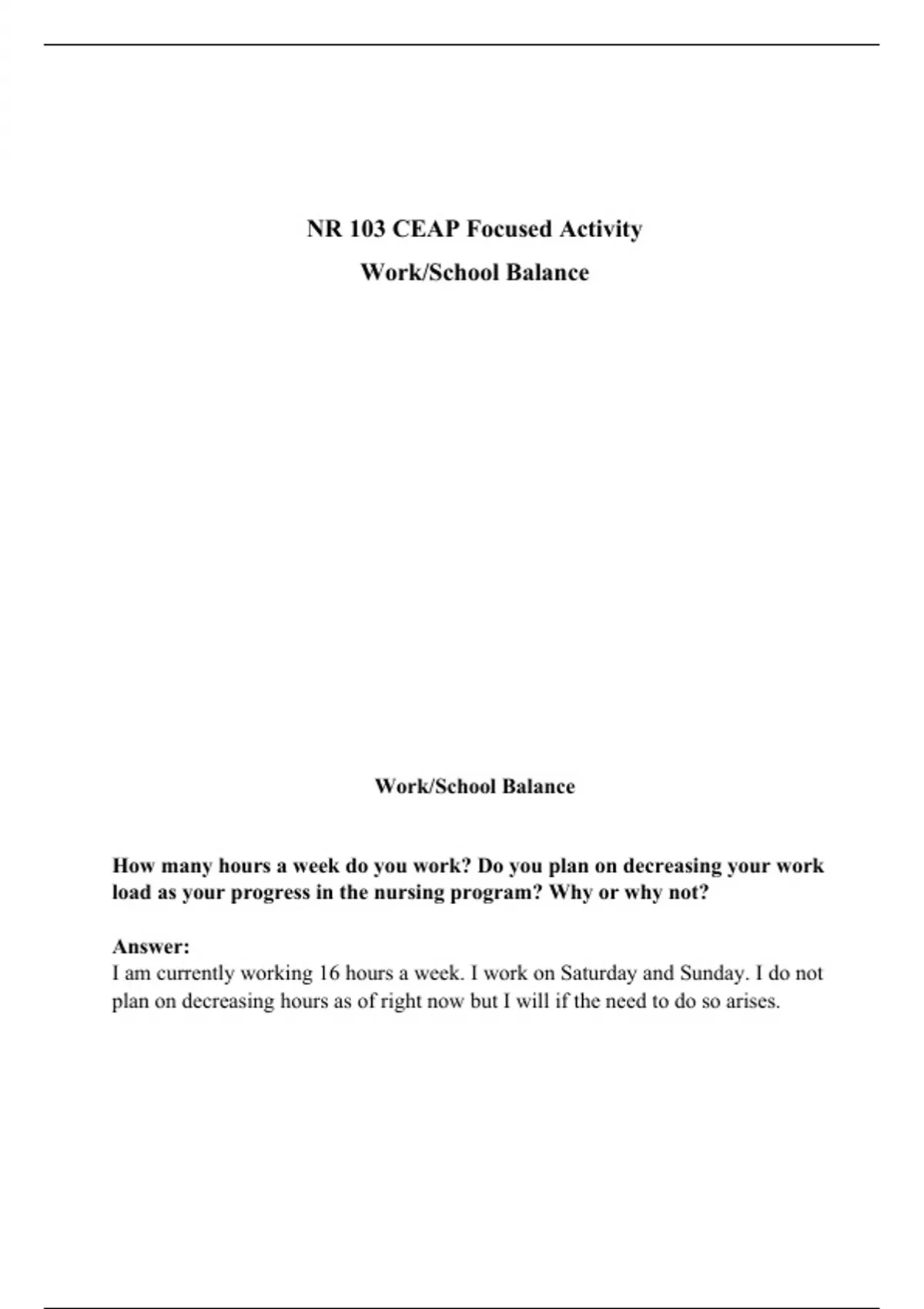 Contains APA Review of knowledge, Complete Transition to the Nursing Profession, Mindfulness Reflection Template, RUA Caring, CEAP Focused activity work/school balance, Final Exam (A+ Graded) with answers. Happy Studying!