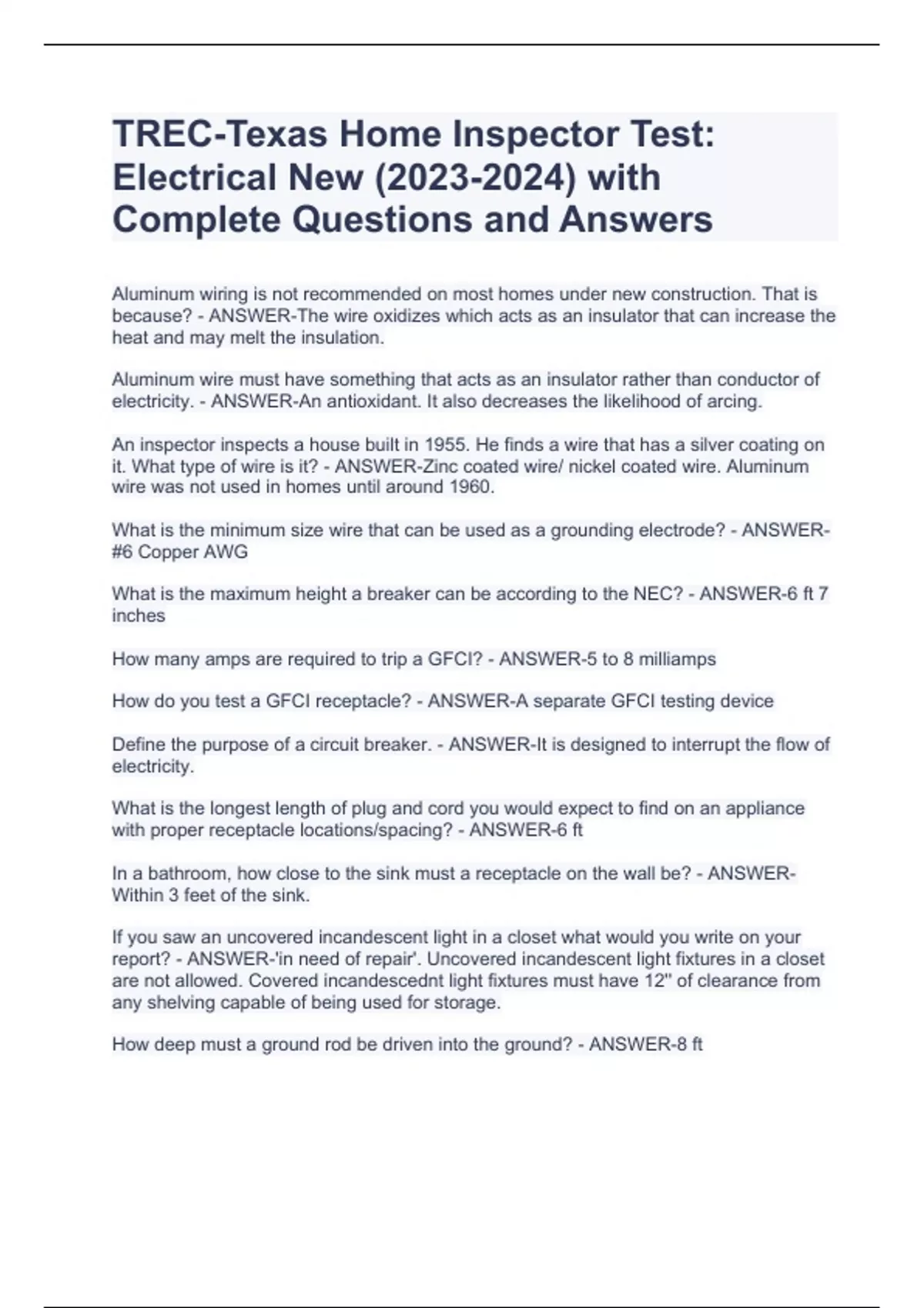 Texas Home Inspection/TREC-Texas Home Inspector/ SAE Residential Inspection EXAM BUNDLE|Questions and Answers 100% CorrectTexas Home Inspection/TREC-Texas Home Inspector/ SAE Residential Inspection EXAM BUNDLE|Questions and Answers 100% CorrectTexas Home Inspection/TREC-Texas Home Inspector/ SAE Residential Inspection EXAM BUNDLE|Questions and Answ