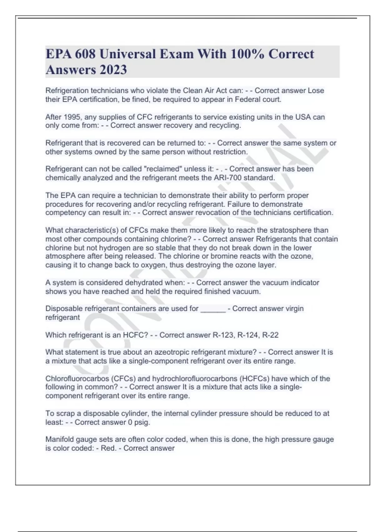 Package deal for EPA 608 Certification Core Practice Test Exam with 100% correct Answers 2023