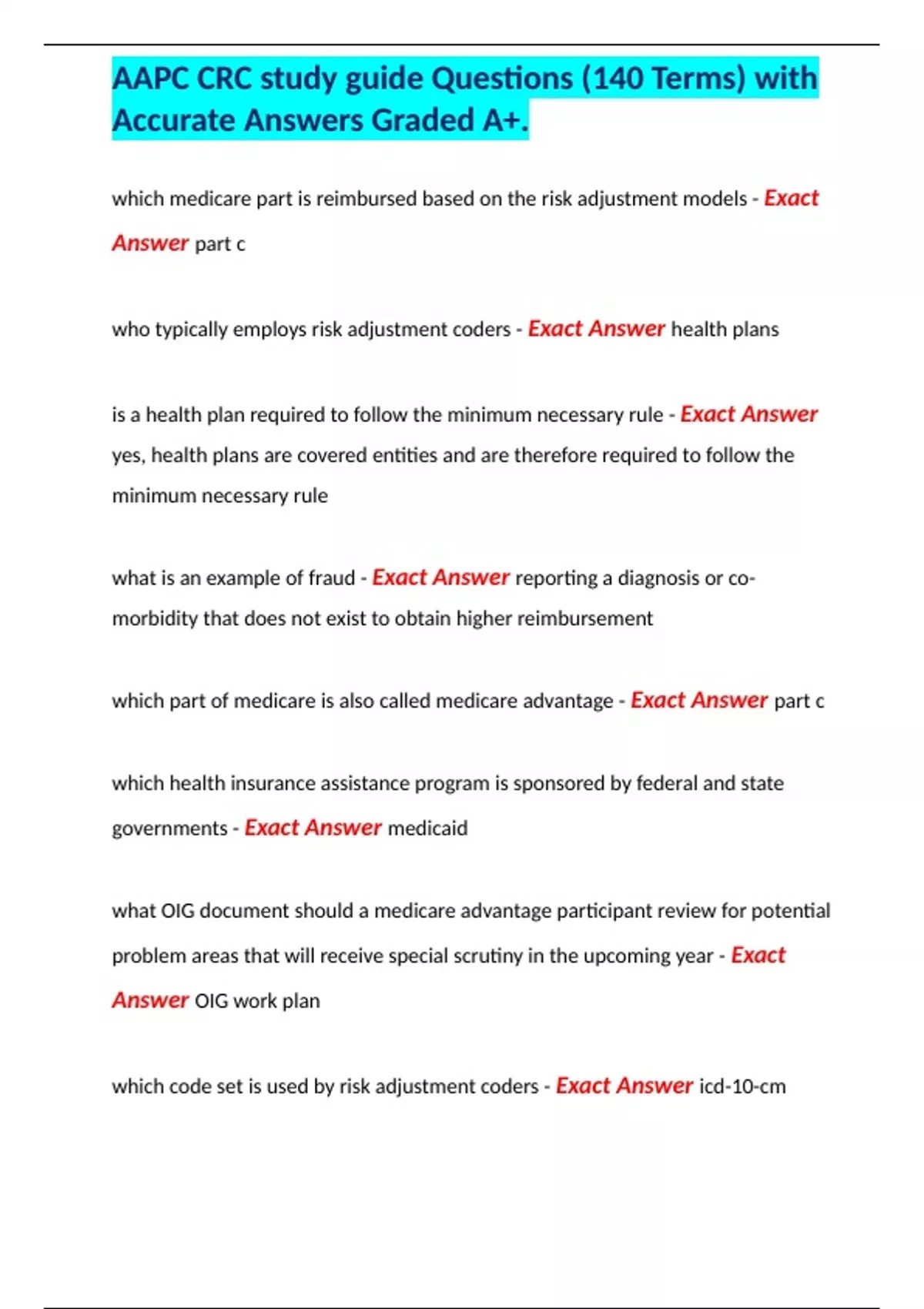 1 Exam (elaborations) CRC Exam Over (750 Questions) with 100% Verified Answers 2023 Update. 2 Exam (elaborations) CRC Test Review Questions & Answers Best Rated A+ 3 Exam (elaborations) AAPC CRC Exam 10 With Over 1600 Correctly Answered Questions Latest Update. 4 Exam (elaborations) AAPC CRC Exam 9 With Over 1500 Correctly Answered Questions 202