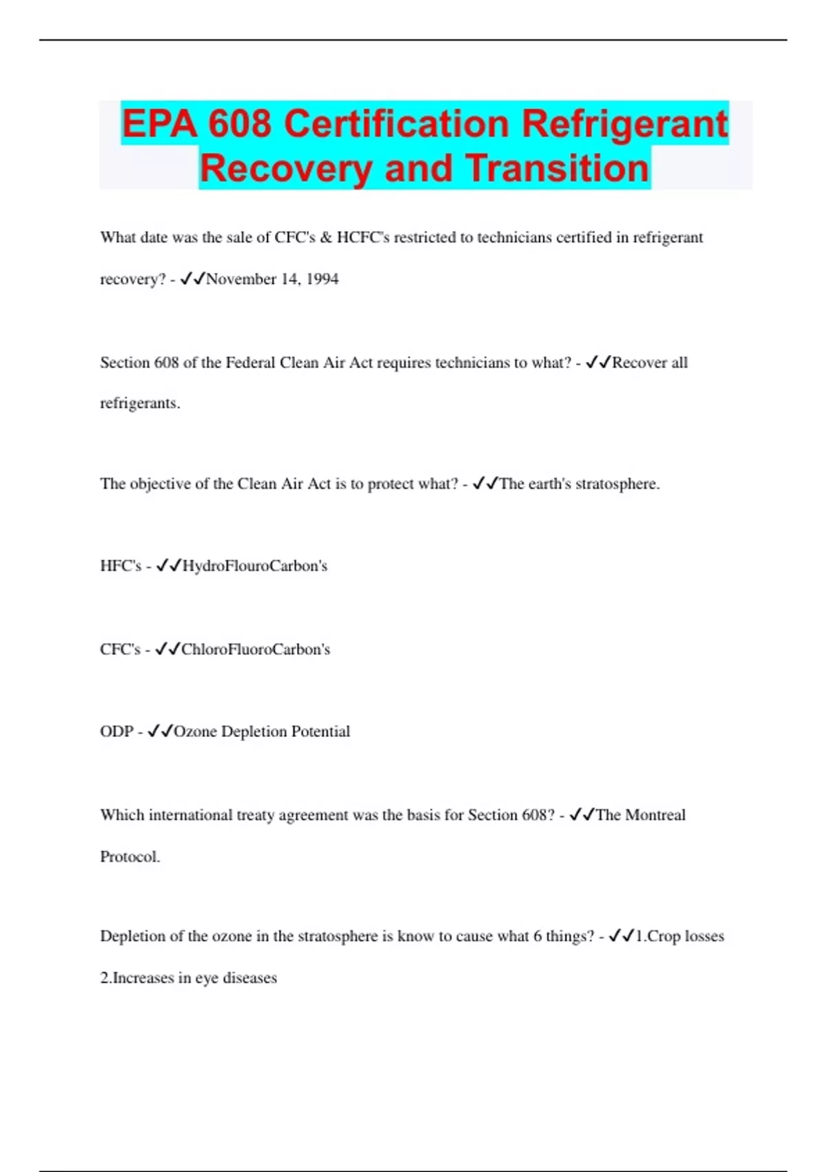 EPA 608 Certification Refrigerant Recovery and Transition | 2023 | 70 Questions with 100% Correct Answers | Updated & Verified