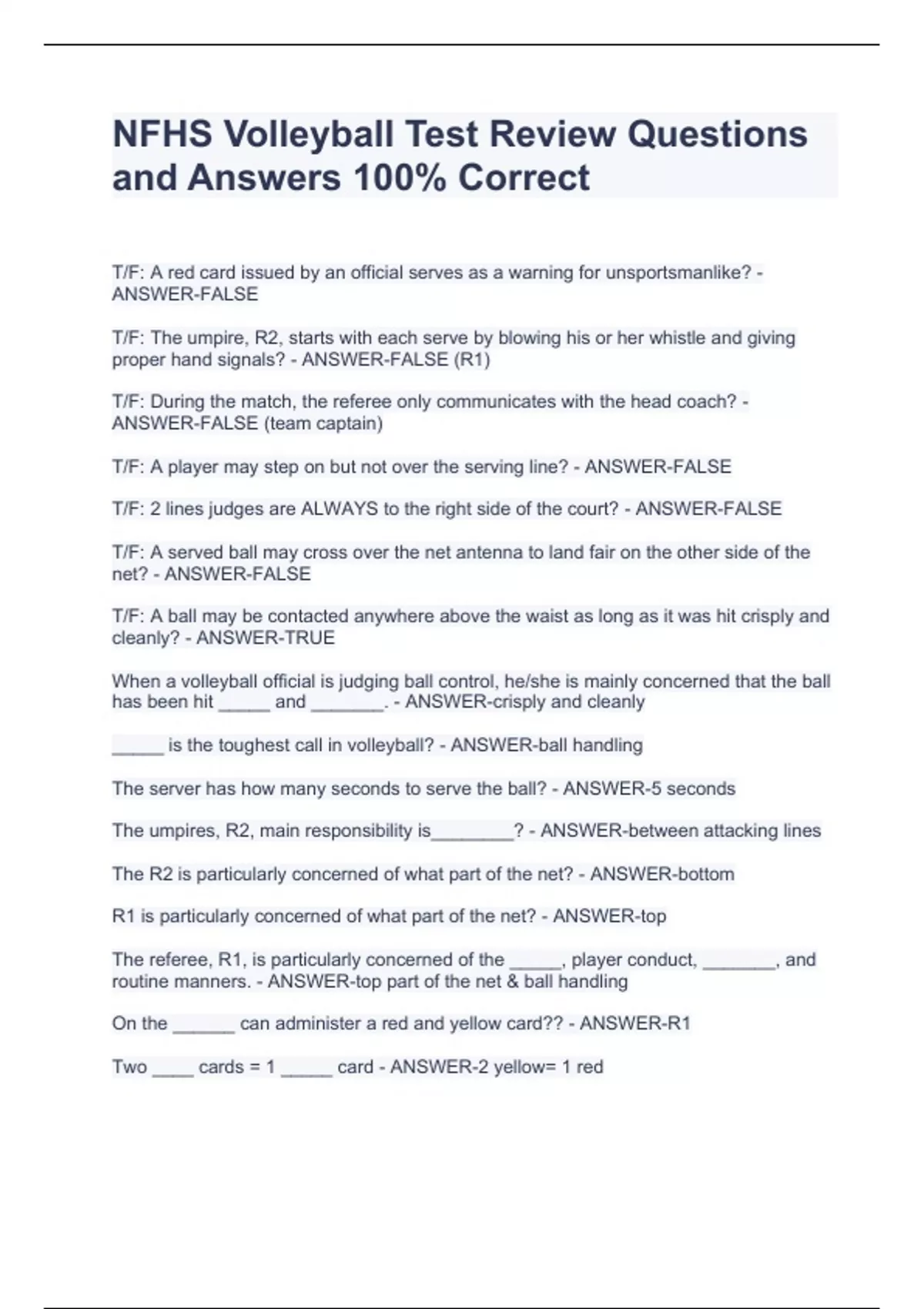 NFHS Volleyball Tests BUNDLE| Questions and Answers 100% Correct