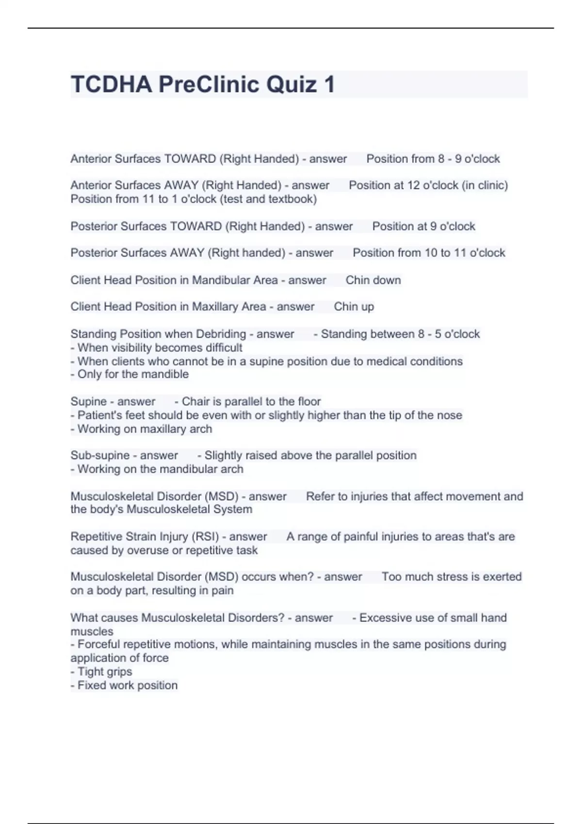 TCDHA PreClinic Quiz 1 Questions with correct Answers