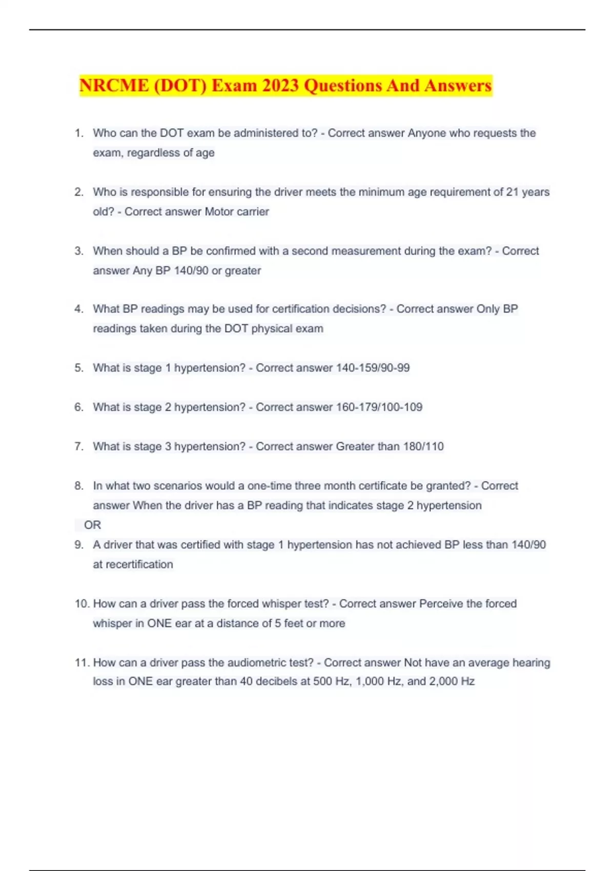 Package Deal for NRCME DOT Examiner Test Practice Questions with Correct Answers Graded A++