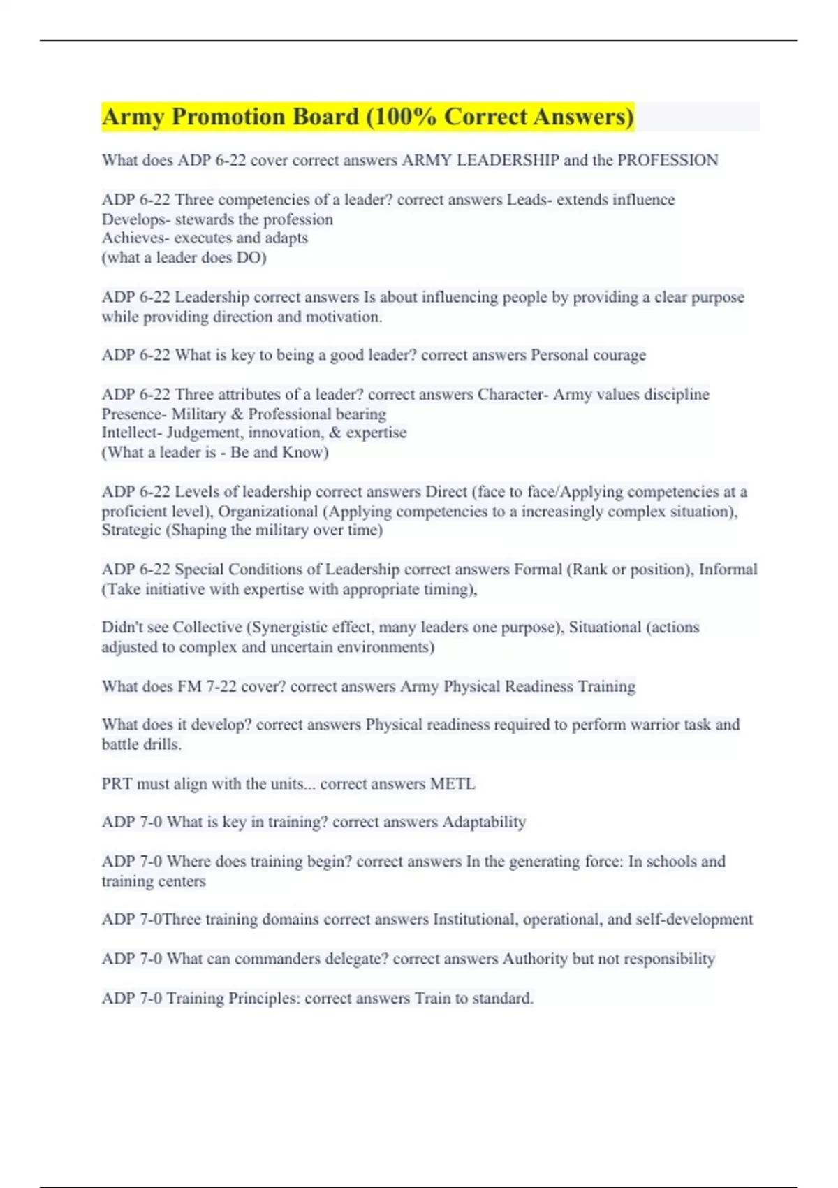 Army Promotion Board (100% Correct Answers) Army Promotion Board Questions (with Complete Solutions) Army Promotion Board 2023 (A+ Guaranteed) Army Board Study Guide (A+ Graded) Army Promotion Board Questions (100% Errorless Answers) Army Promotion Board (100% Accurate Answers) Army Promotion Board questions (All Correctly Solved)