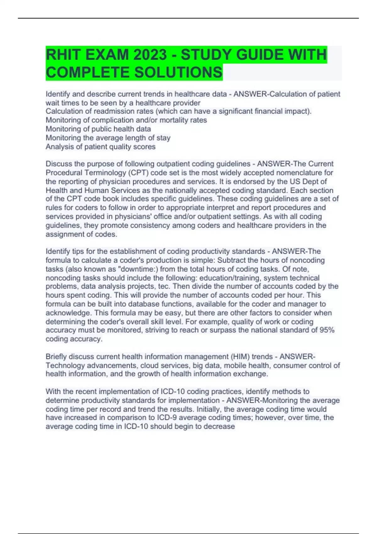 RHIT EXAM 2023 - STUDY GUIDE WITH COMPLETE SOLUTIONS RHIT CERTIFICATION PREP LATEST UPDATED RHIT Exam Prep 2023 with Complete Solutions PURPLE BOOK RHIT PRACTICE EXAM 2, RHIT Exam 1 SOLVED 100% RHIT STUDY GUIDE WHITE BOARD NOTES 2023 WITH COMPLETE SOLUTIONS Mindtap Questions RHIT Exam 2023/24 Graded A+ AHIMA RHIT Practice Exam 2023/2024