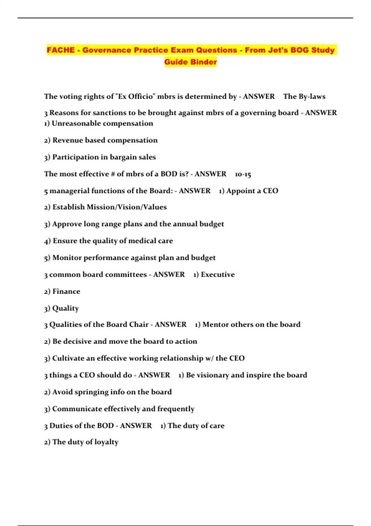FACHE - Governance Practice Exam Questions - From Jet's BOG Study Guide Binder