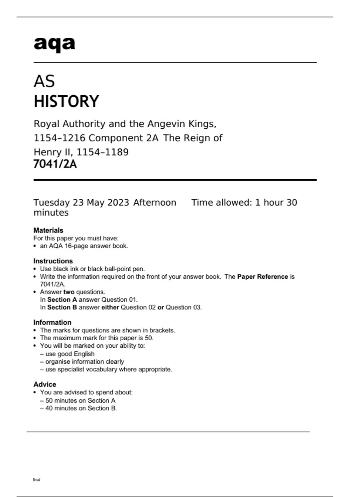 Aqa AS History 7041/2A Question Paper and Mark Scheme June23. Aqa AS History 7041/2A Mark Scheme June23. Aqa AS History 7041/2A May2023 Question Paper