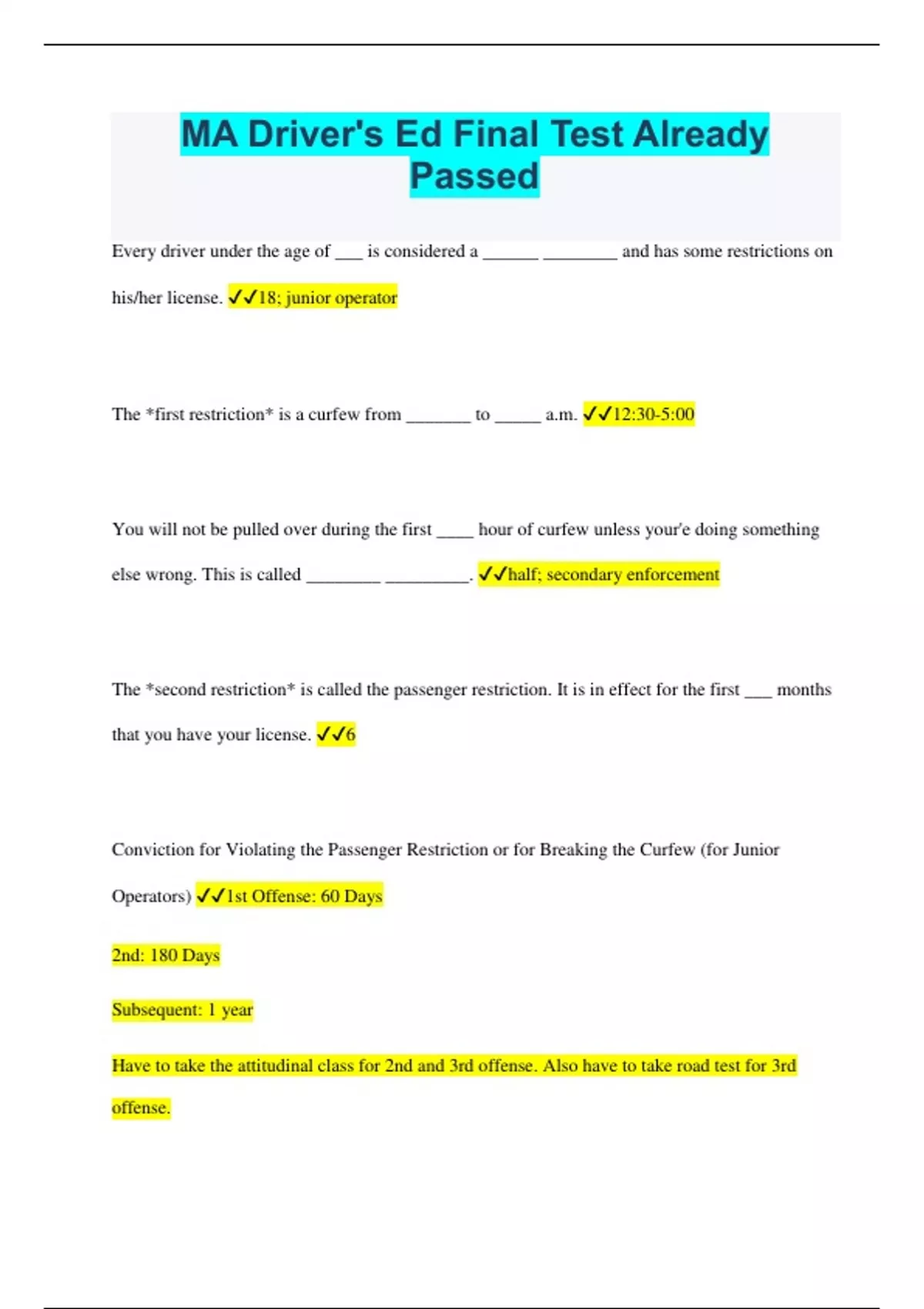 MA Driver's Ed Final Test Already Passed
