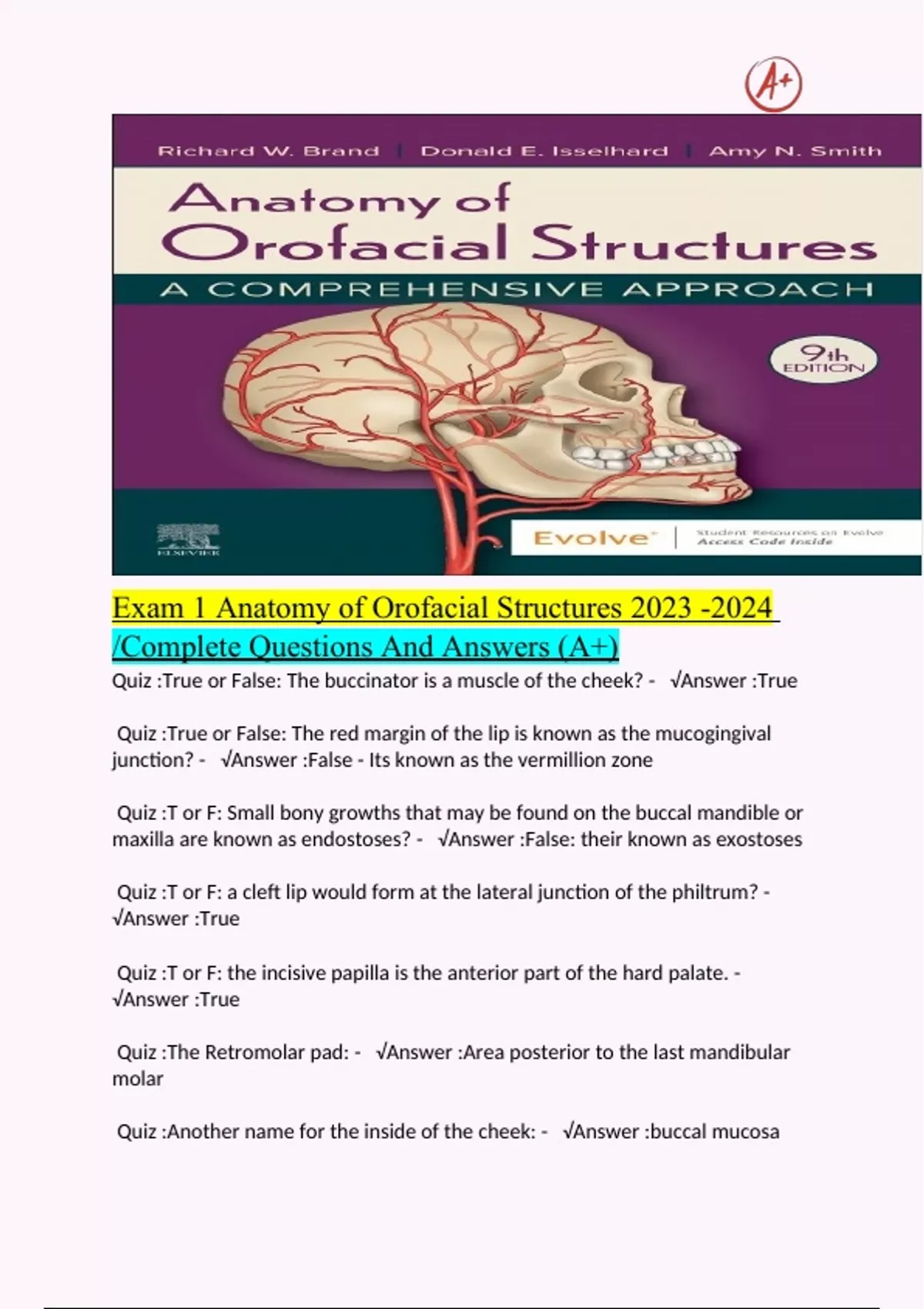 Exam 1 Anatomy of Orofacial Structures Complete Questions And Answers (A+).