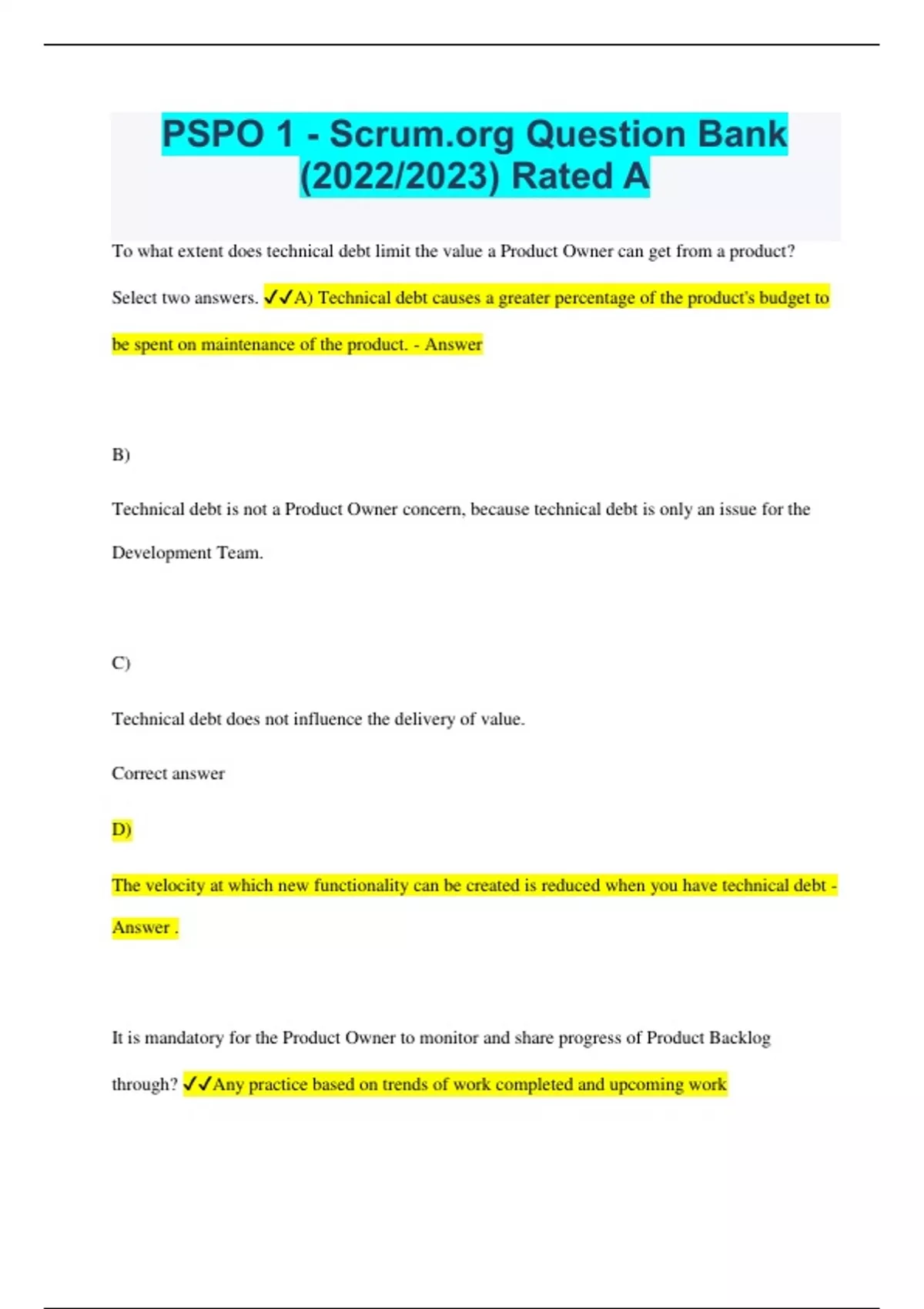 PSPO Questions and Answers 100% Pass,PSPO I, PSM I e PSPO I Questions and Answers Already Passed,PSPO I Exam Prep (w/ Michael) Latest Update with Complete Solutions,PSPO 1 Questions and Answers with Verified Solutions,PSPO 1 – ChuongLV Questions and Answers Graded A,PSPO 1 - Scrum.org Question Bank (2022/2023) Rated A