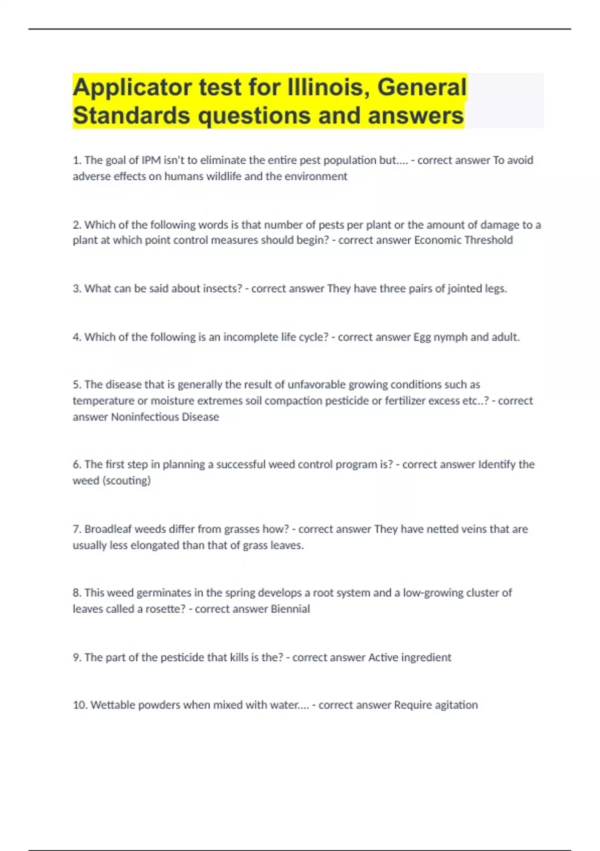 Illinois Pesticide Applicator Test questions and answers.