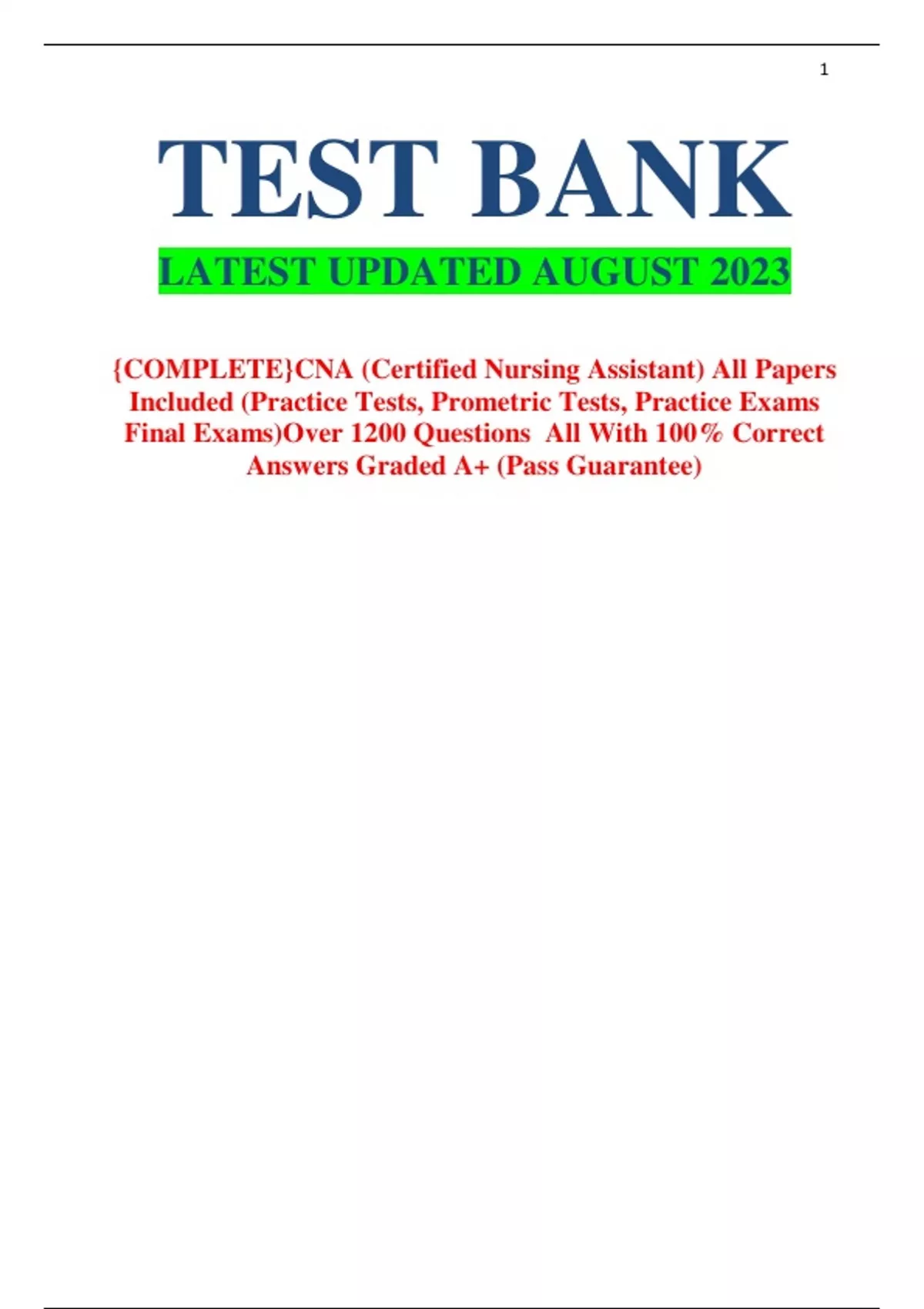 CNA(CERTIFIED NURSING ASSISTANT) EXAM BUNDLE.Final, Practice and Written exams 2023(100% verified)