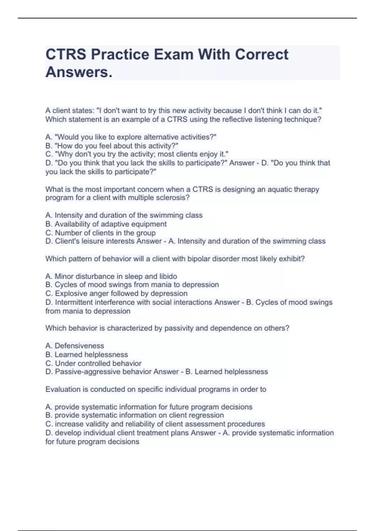 CTRS Exam With Correct Solutions .,CTRS EXAM With Correct Answers.,Assessment Process CTRS With Answers.,CTRS Exam Study Guide With Correct Answers.,CTRS Exam Assessments With Answers.,CTRS Practice Test 1 With Correct Solutions.,CTRS Exam (assessment questions) :-) With Correct Answers.,