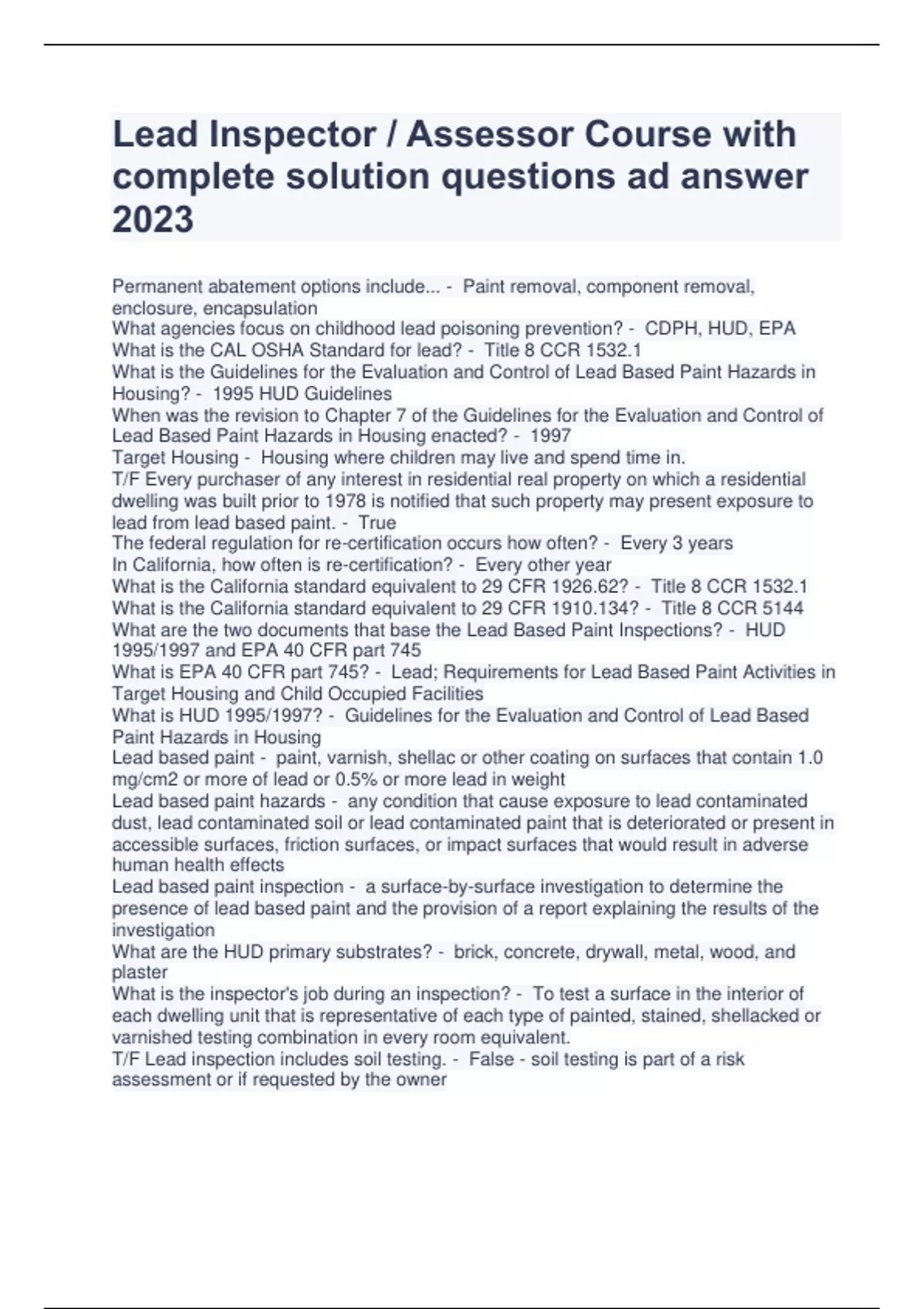 Lead Abatement Supervisor | 2023 questions and answers 100% verified,Lead Paint Abatement Supervisor Review 2023 with complete solution,Lead Inspector/Risk Assessor | ALL QUESTIONS AND ANSWERS 2023 GRADED A+!!,EPA Lead Risk Assessor Exam Study Guide 2023 With correct questions and answers GRADED A+!!,Lead Inspector / Assessor Course with complete s
