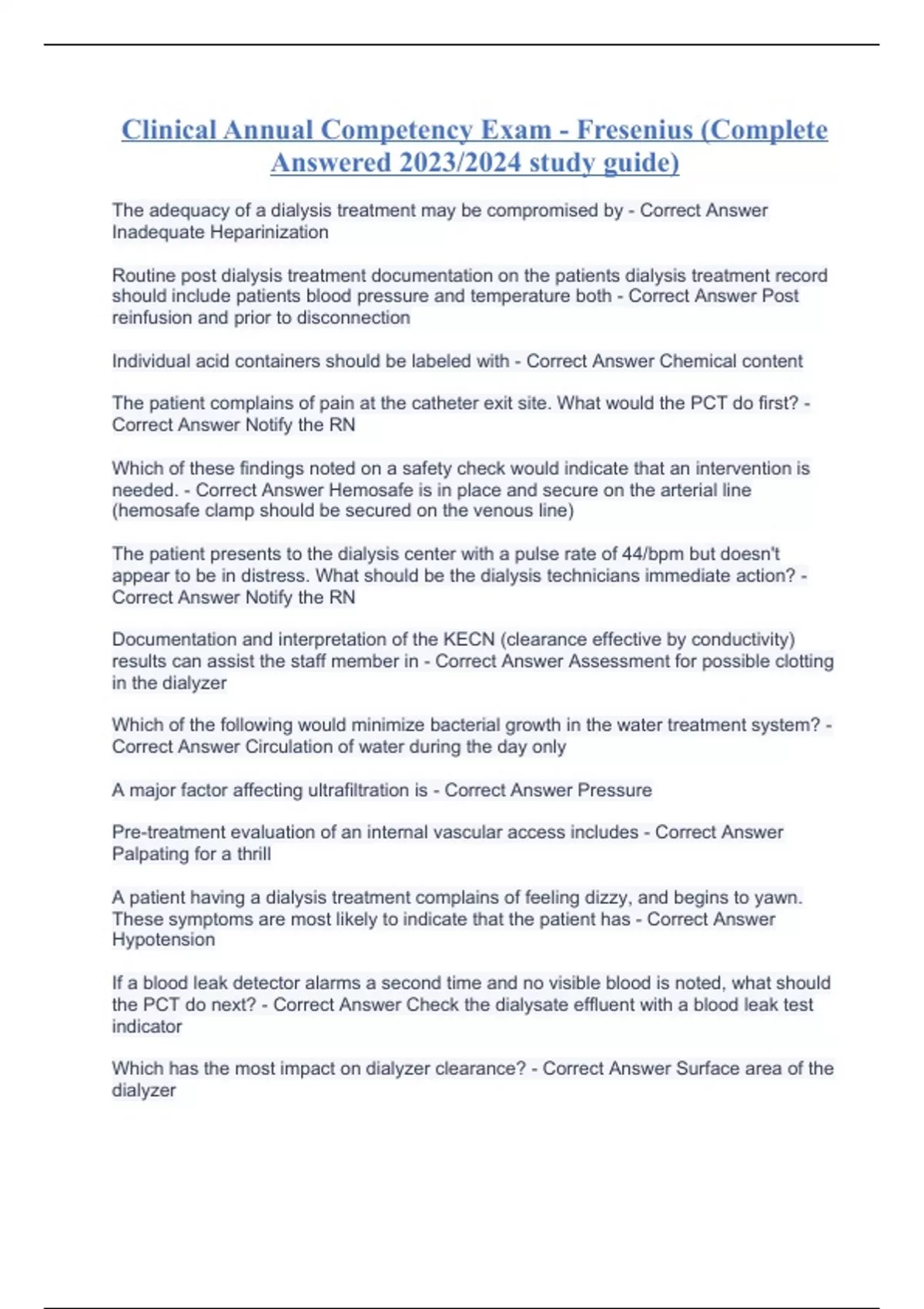 Clinical annual competency FMC with questions and answers, Fresenius annual competency exam with correct answers 100% verified, Fresenius annual competency study guide with complete solutions, Annual Competency Exam 2023/2024 Study Guide with Complete Solutions, Clinical Annual Competency Exam - Fresenius (Complete Answered 2023/2024 study guide)