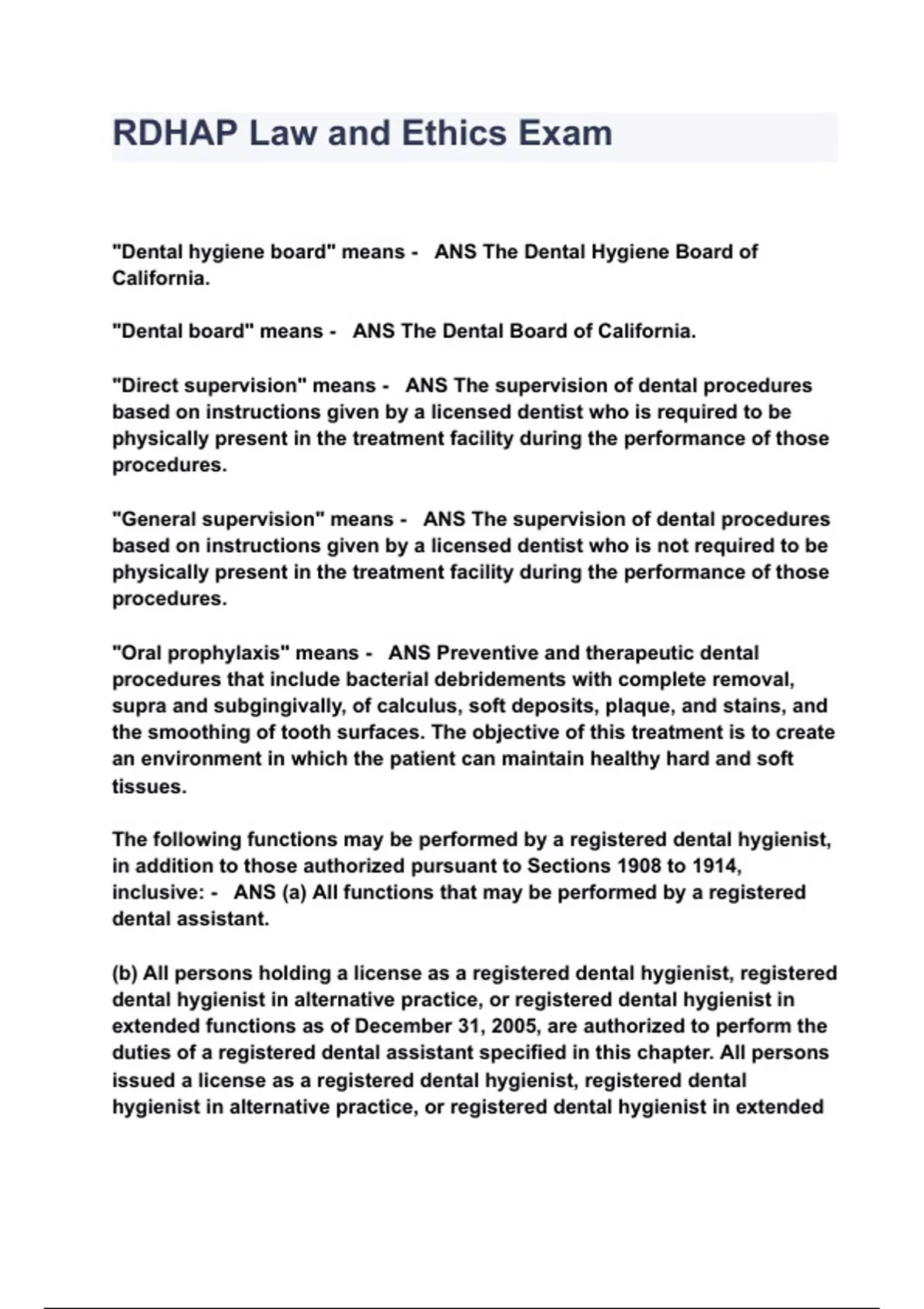 RDHAP Law and Ethics Exam BUNDLE|| ACTUAL EXAMS|| ACTUAL TESTS|| FULL PACKAGE SOLUTION 2023 ( A+ GRADED 100% VERIFIED)