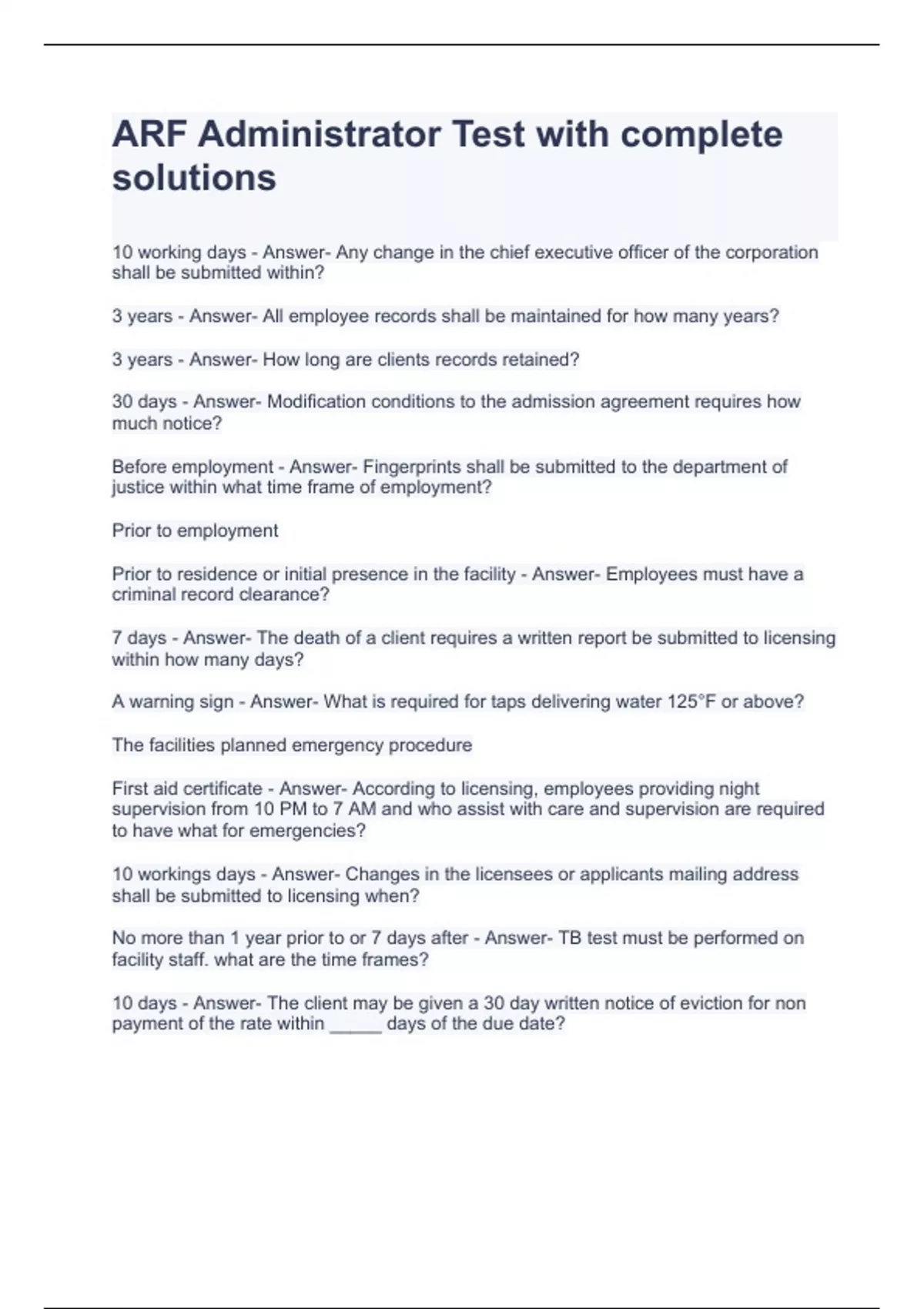 ARF Administrator Test with complete solutions Adult Residential Facility (ARF) Practice Test Questions and Answers ARF (Adult Residential Facility) State Test 2023 –Solved ARF FINAL TEST PREPARATION-QUESTIONS WITH CORRECT ANSWERS Adult Residential Facility Study Guide notecards with complete solutions ARF (Adult Residential Facility) SCLARC Test