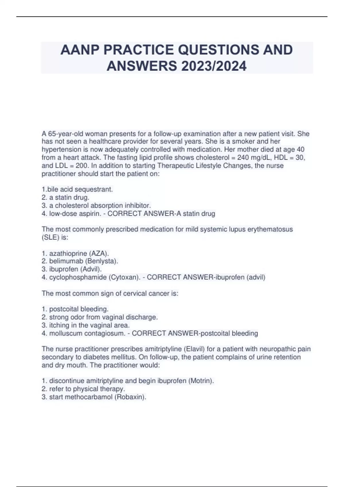 PRACTICE TEST AANP EXAM 2023/2024(QUESTIONS AND ANSWERS) EXAM 2023/2024 AANP STUDY GUDE TEST EXAM AANP CERTIFICATION EXAM 2023/2024 AANP STUDY QUESTIONS AND ANSWERS (2023/2024 A+ GRADED LATEST EXAM) NURSE PRACTITIONER EXAM AANP STUDY GUIDE 2023/2024 AANP REVIEW QUESTIONS AND ANSWERS EXAM (2023/2024) AAANP EXAM REVIEW AANP EXAM REVIEW QUESTIONS AND