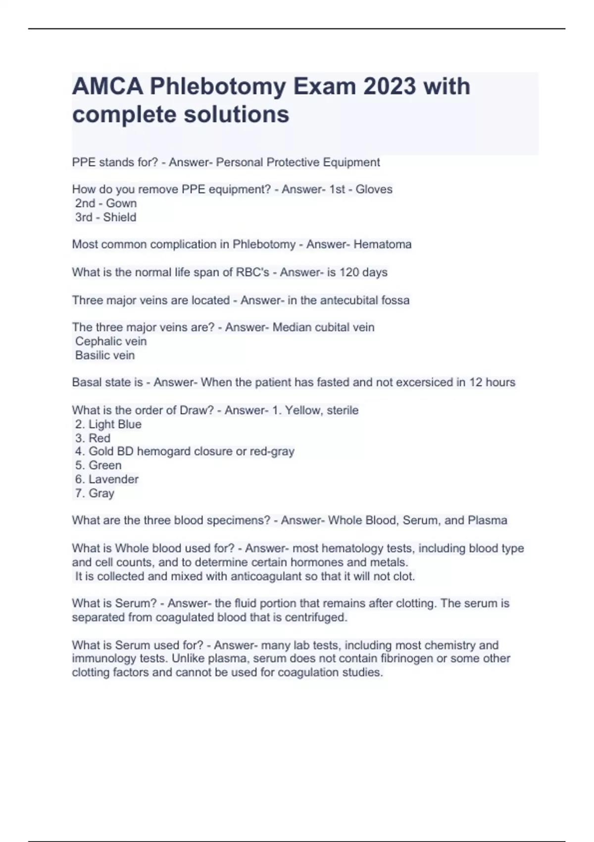 AMCA Phlebotomy Exam 2023 with complete solutions AMCA Phlebotomy pre-test 2023-solved AMCA Phlebotomy Certification Prep Exam Questions and Answers 2023 amca phlebotomy exam review 2023 questions and answers AMCA National phlebotomy Exam Review 2023 Questions and Answers AMCA Phlebotomy Exam with complete solutions Phlebotomy AMCA Test Review 2023