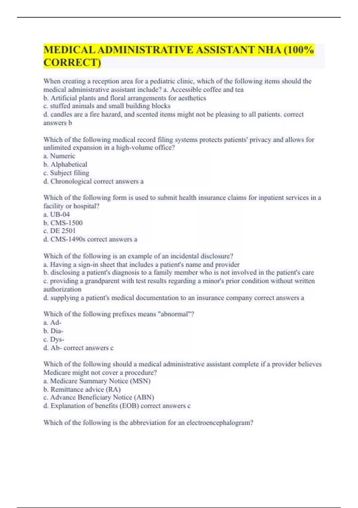 Certified Medical Administrative Assistant Exam (A+ Graded Already) MEDICAL ADMINISTRATIVE ASSISTANT NHA (100% CORRECT) Med Administration (100% Correct Answers) Administrative Medical Assisting 8th Edition (100% Error-free Solutions) Administrative Medical Assisting Ch.10 (Answered Correctly 100%) All Chapters Administrative Medical Assistant 2023