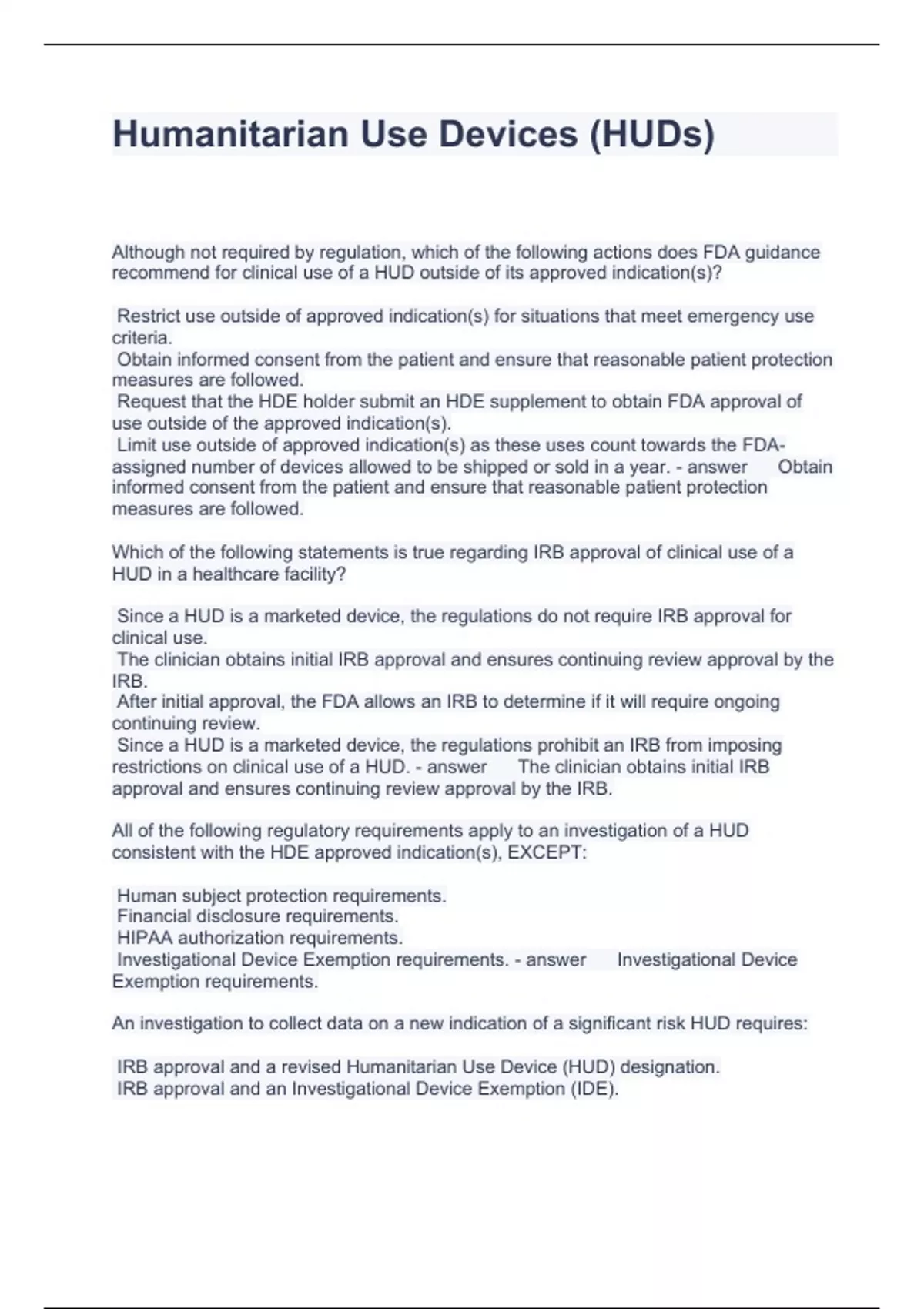 Humanitarian Use Devices Questions and Answers latest updated 2023