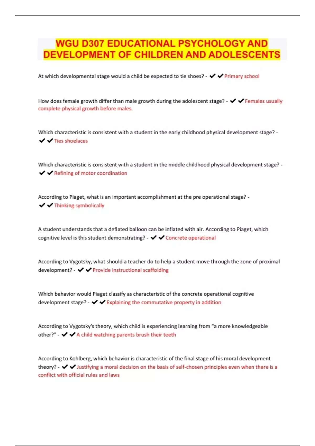 WGU D307 EDUCATIONAL PSYCHOLOGY AND DEVELOPMENT OF CHILDREN AND ADOLESCENTS | Latest 2023/24 | Updated & Verified | Guaranteed Success