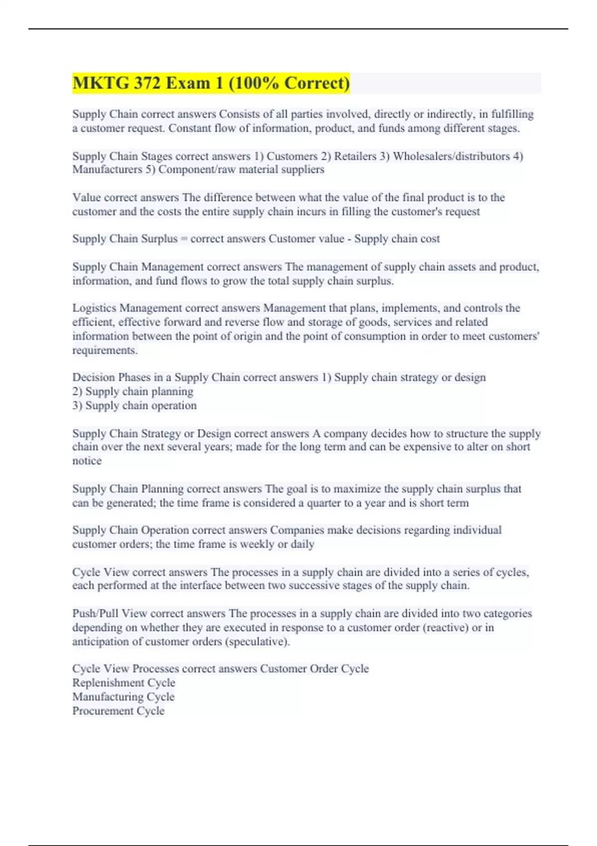 Mktg 372 final exam: Supply Chain Mgmt Gligor (All Correctly Answered) MKTG 372 Exam 1 (100% Correct) MKTG 372 Ch1 (100% Verified) MKTG 372 Exam 1 (100% Accurate) MKTG 372 Rego Test 1 (100% Errorless) MKTG 372 Exam 1 study guide (100% Error-free) MKTG 372 Final Exam (A+ Graded) MKTG 372 SDSU (A+ GUARANTEED) MKTG 372 EXAM 2 (with Complete Solutions)